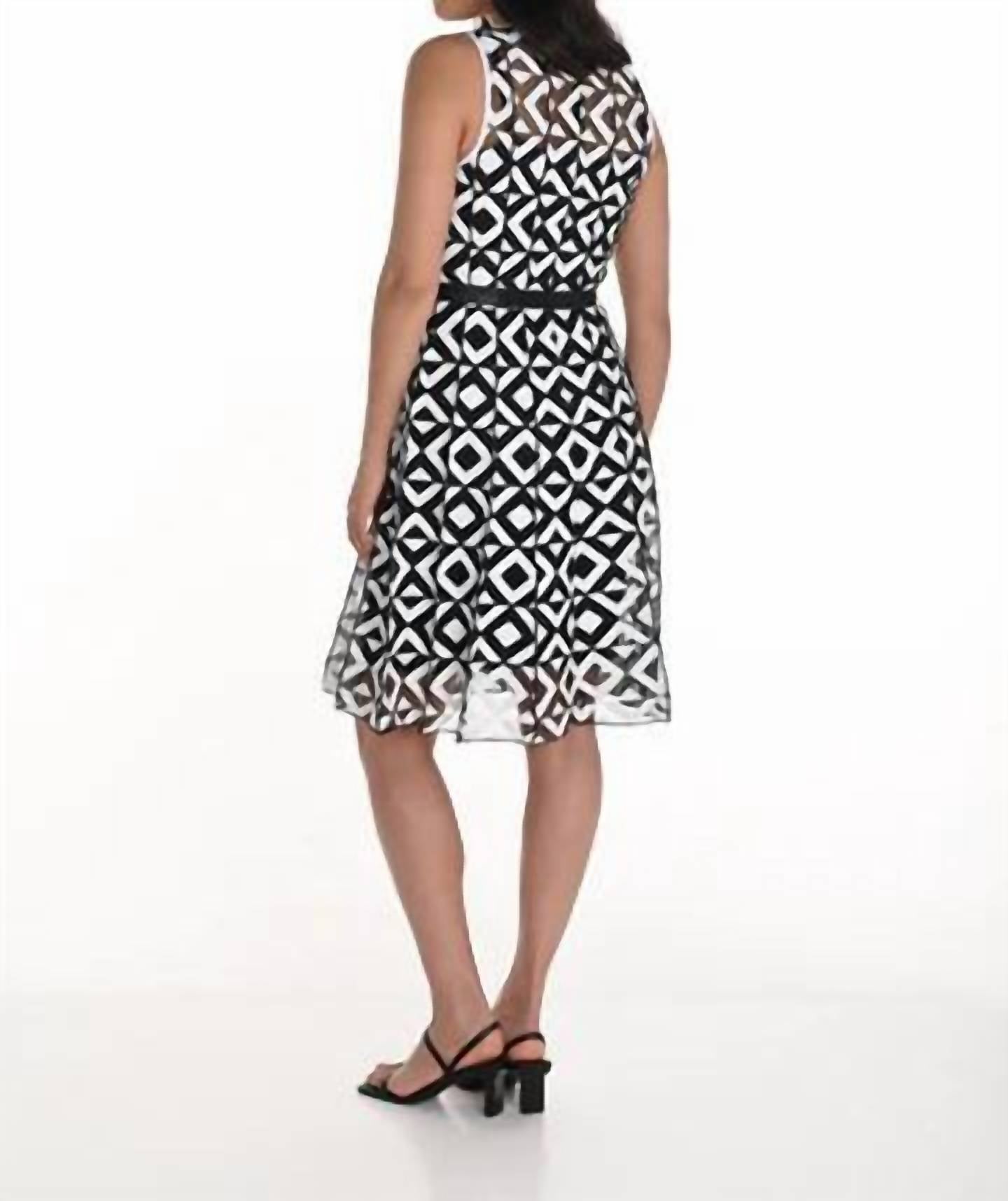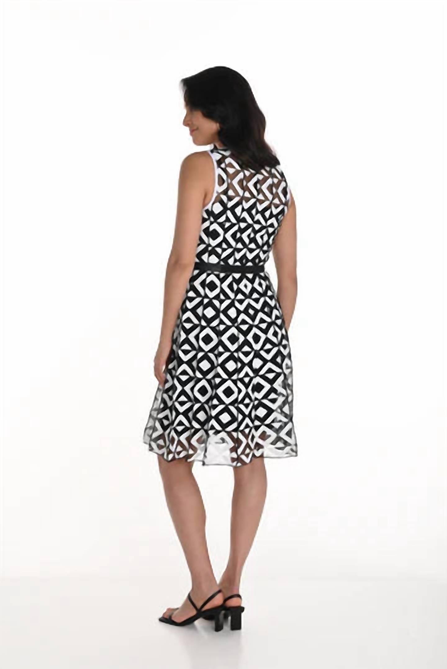 A short and breezy dress for those warmer days. Introducing the Geometric Lace Dress by Frank Lyman, a standout piece in bold black and white with a striking geometric pattern. This sleeveless, A-line mini dress features a chic sheer overlay and a waist tie for a dose of timeless elegance. Made from durable polyester, it's perfect for holiday parties or any occasion where minimalist style is desired. Care for your dress with a machine wash and hang dry for effortless maintenance.