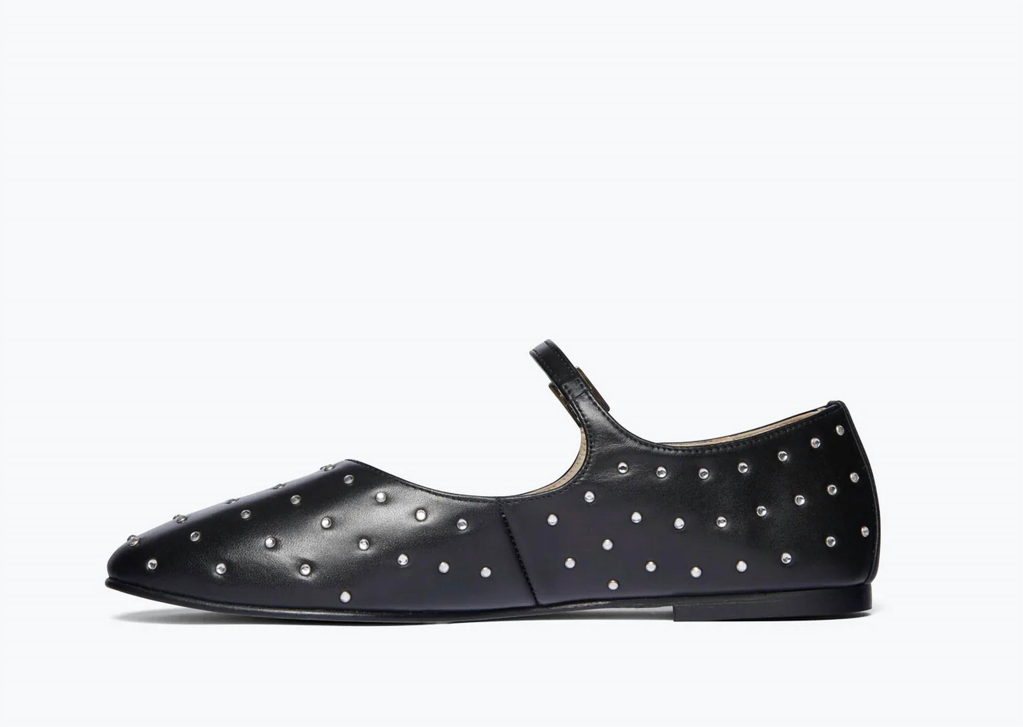 Loafers so versatile you can wear them with just about anything. Step into elegance with the Women's Aubrey Mary Jane Flat Shoes by FREDA SALVADOR, meticulously handcrafted in Spain. These flats boast a 100% Italian Leather composition featuring a padded leather footbed and a beveled leather sole, complemented by a 0.25" rubber heel for all-day comfort. Perfect for holiday parties, the round toe design exudes quiet luxury and sophistication. Adorned with black calf leather and crystals, these timeless flats are an essential for seamless day-to-night wear.