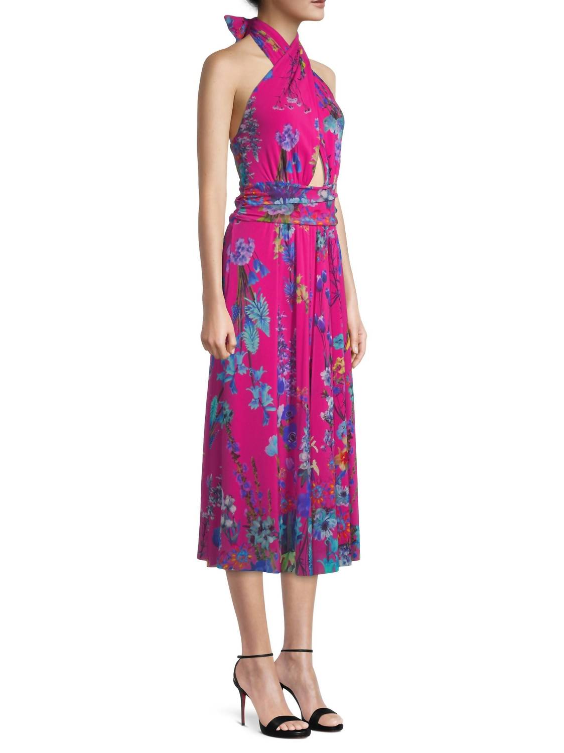 Just add slides or mules and you are good to go. Embrace romantic elegance with the Abito Sleeveless Dress by FUZZI, featuring a whimsical floral print in begonia. This chic midi dress is sleeveless with a halter neckline and a stylish cut-out detail. Crafted from 100% polyamide with a polyester lining, it boasts a luxurious Italian design. The dress offers a back tie closure and measures approximately 48 inches from shoulder to hem, recommended for dry cleaning to maintain its refined appeal.