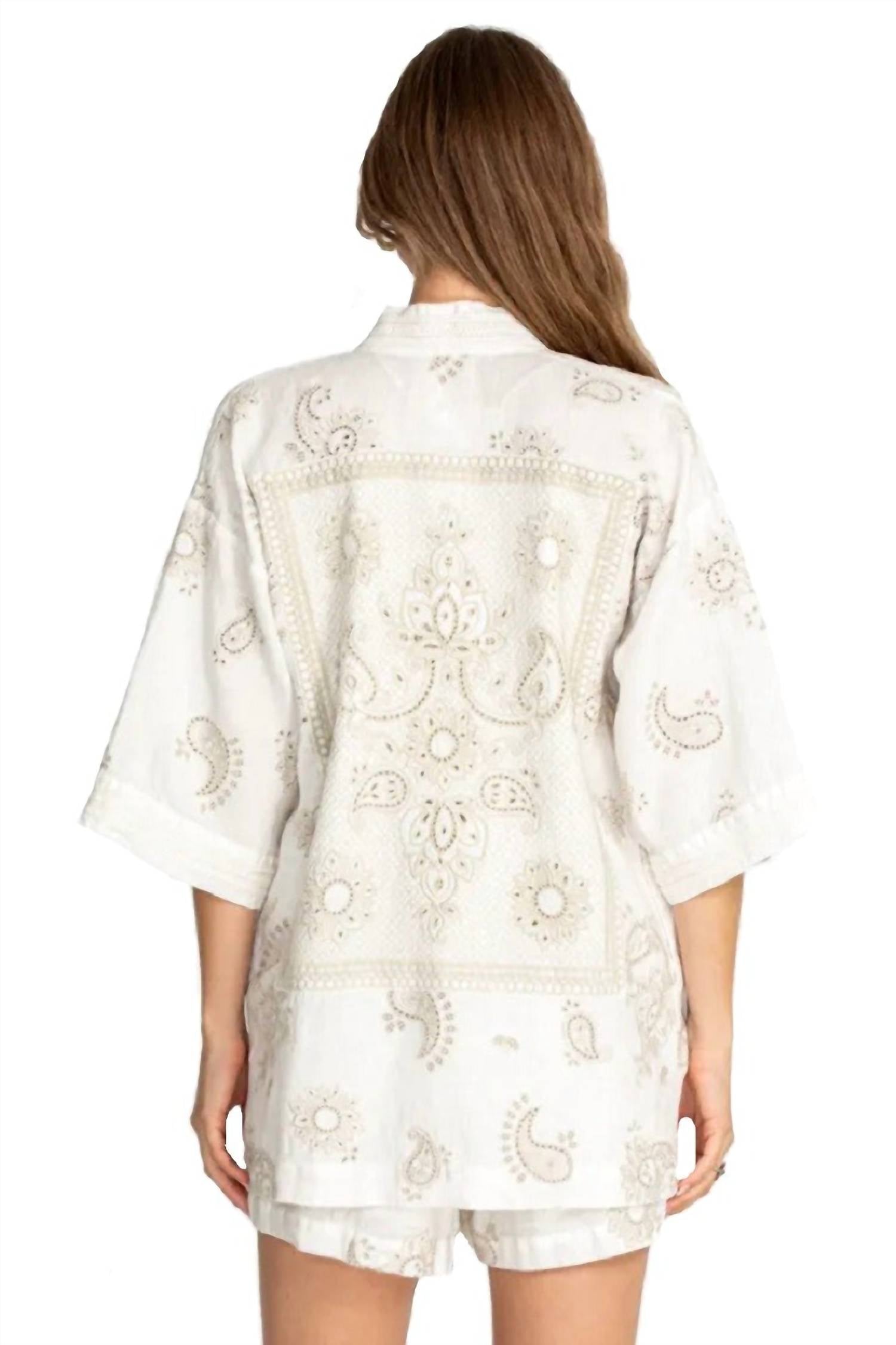 A classic fit that works just as good buttoned as it does left open. 100% LinenLace TrimsMeasurements for a Size Medium: Length- 32", Bust- 46"With its paisley motifs and soft linen fabric, the Faye Kimono is both stylish and comfortable. The lined cuffs and plackets add structure to the garment while creating a discreet contrast, and the linen fabric is ideal for creating a sophisticated draped effect.