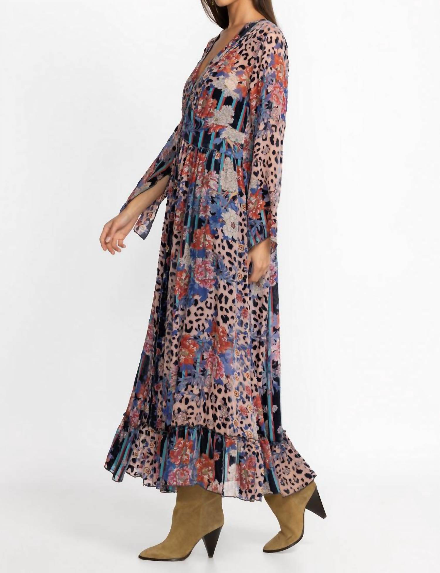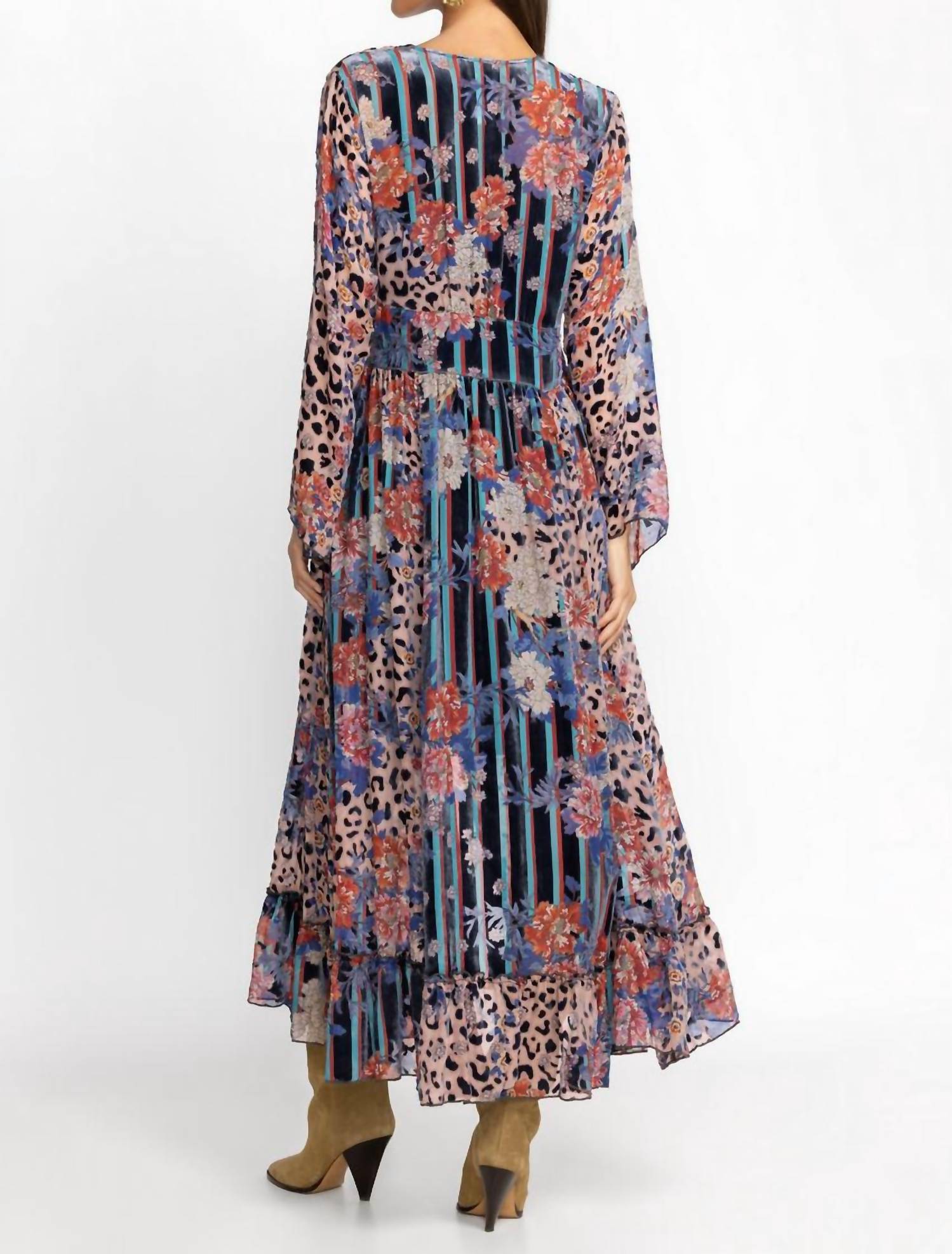 Style this maxi with your favorite statement necklace and sandals for the perfect look. Discover the Ontar Beesley Maxi Dress by Johnny Was, a captivating piece with a vibrant floral pattern perfect for any occasion. This women's dress is crafted from 82% Rayon, 18% Silk and features a slip dress silhouette with long sleeves and an elegant V-neckline. The dress includes a button closure for a secure fit. Care: Dry clean only and line dry.