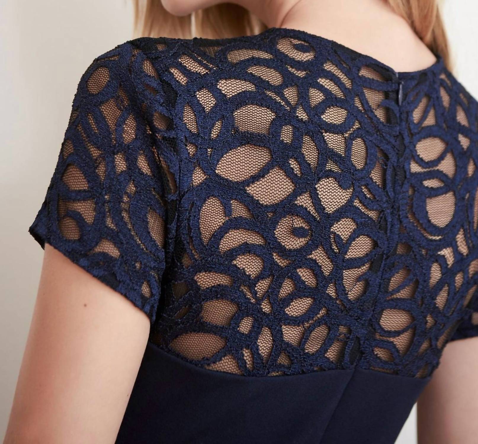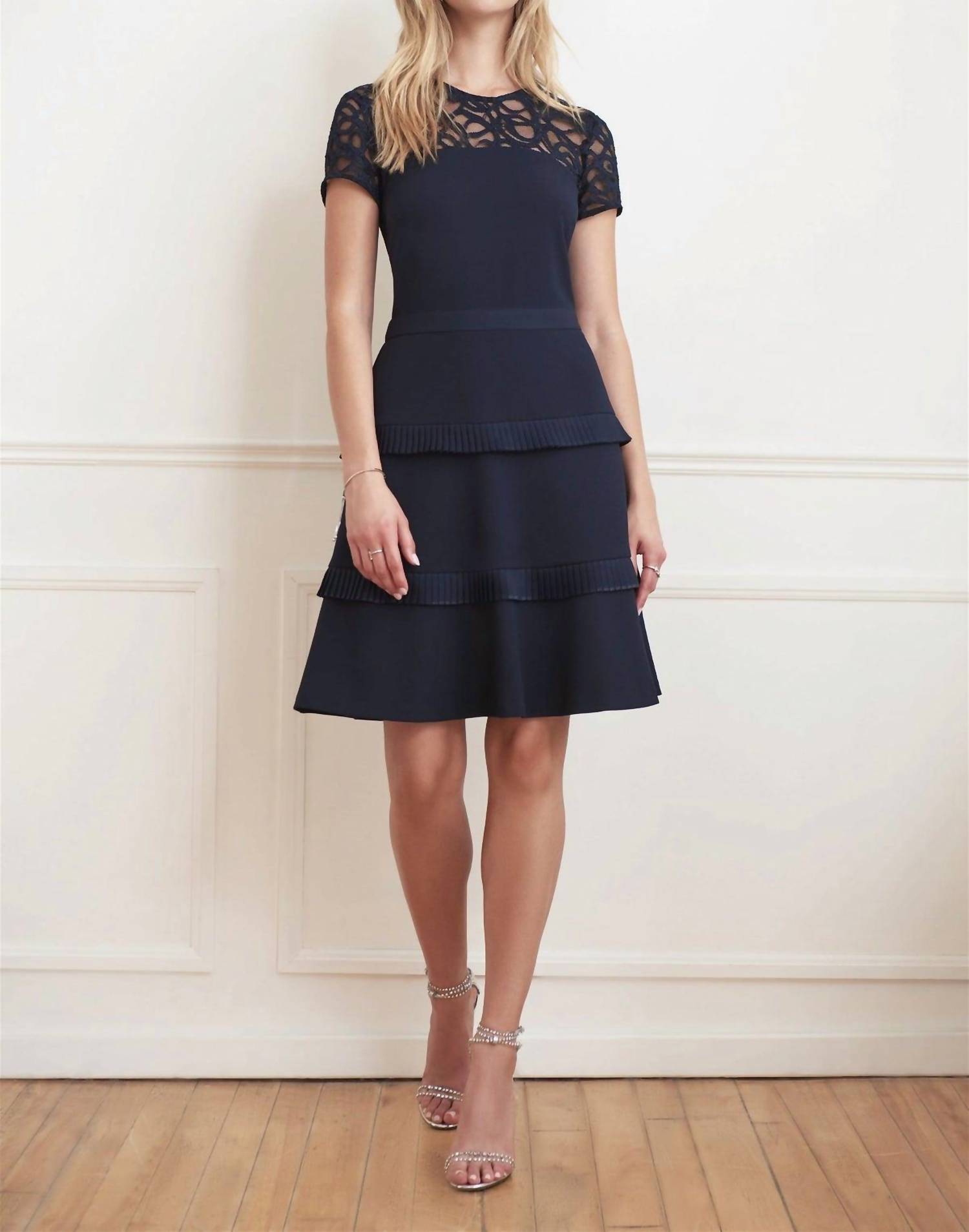 The perfect mini dress for those warmer months. Crafted with short sleeves, this mini dress contours perfectly to your form, featuring a luxurious lace neckline and a sophisticated tiered skirt. Composition: 69% Polyester, 29% Nylon, 2% Spandex. Closure: Back zip. Made in Canada. Care: Hand wash. Length: 38 inches (97 cm).