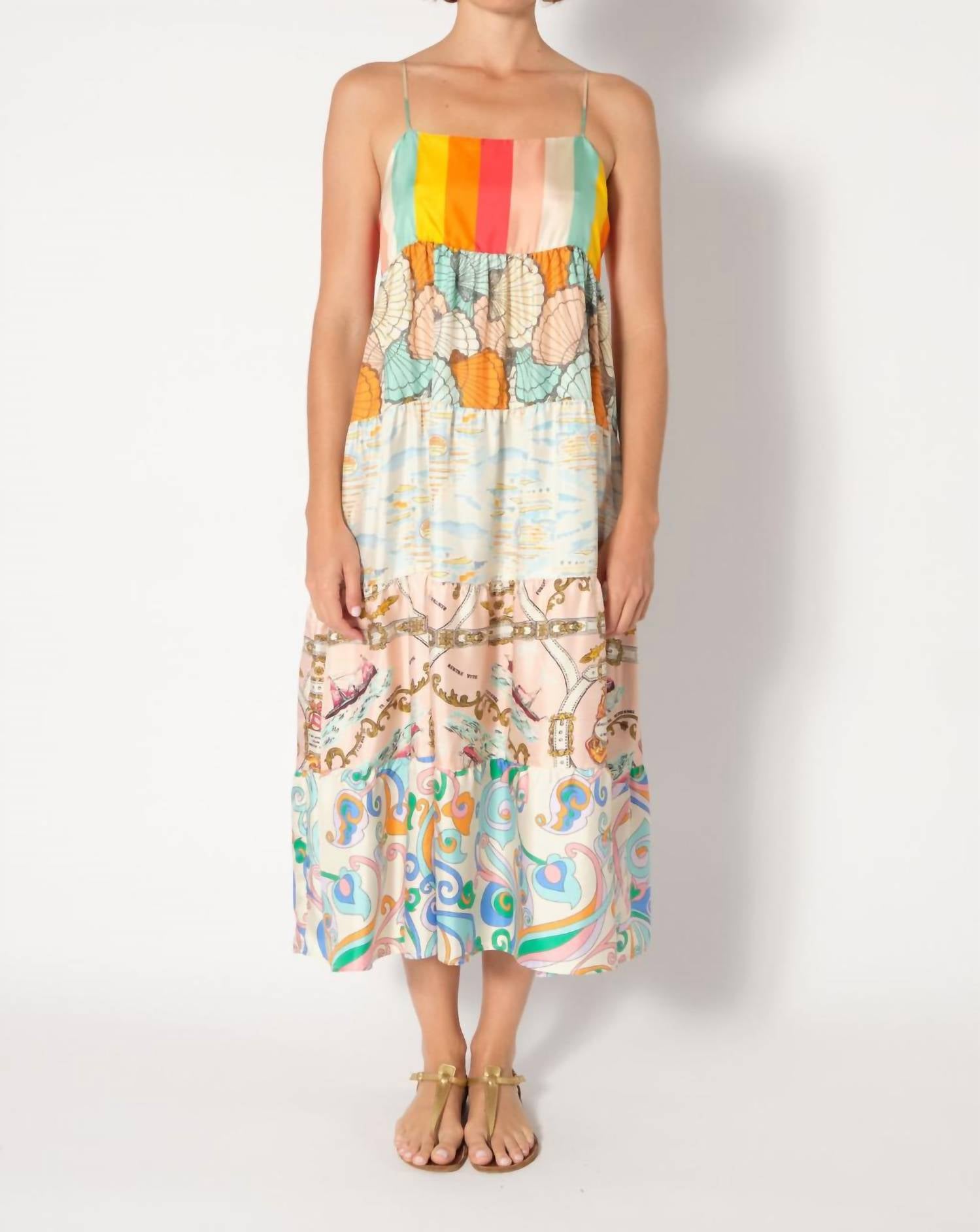 Just add slides or mules and you are good to go. Introducing the Fidji Midi Dress by LA PRESTIC OUISTON, a vibrant summer piece with spaghetti straps and a squareneck for a boho chic look. Crafted entirely from 100% Silk in Europe, this five-tiered A-line dress features an exclusive array of intricate prints, offering a mix of patterns perfect for any vacation. Special details include two luxurious gold buttons on the back, adding a touch of elegance. Care for this exquisite garment with dry clean only instructions to maintain its premium quality.