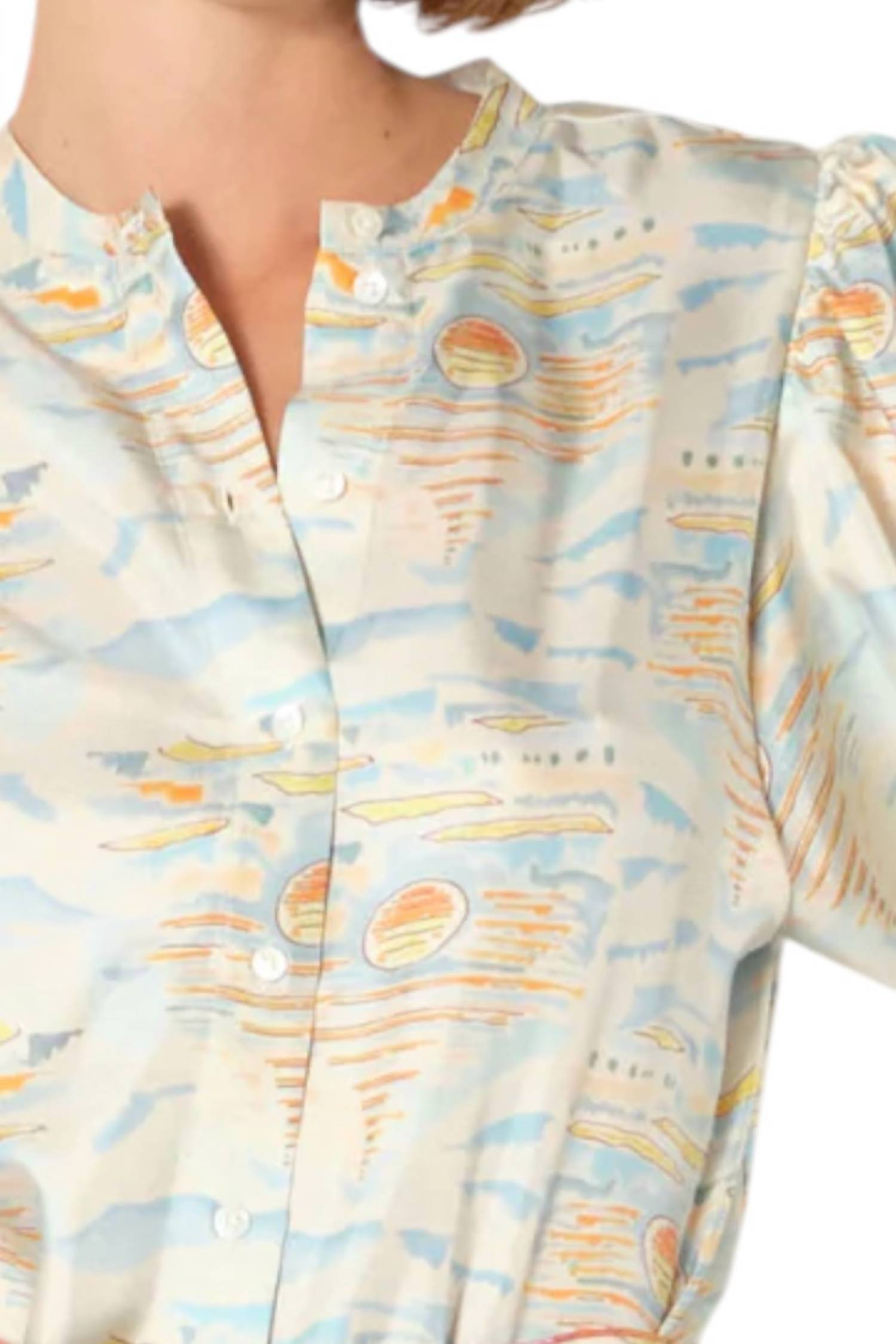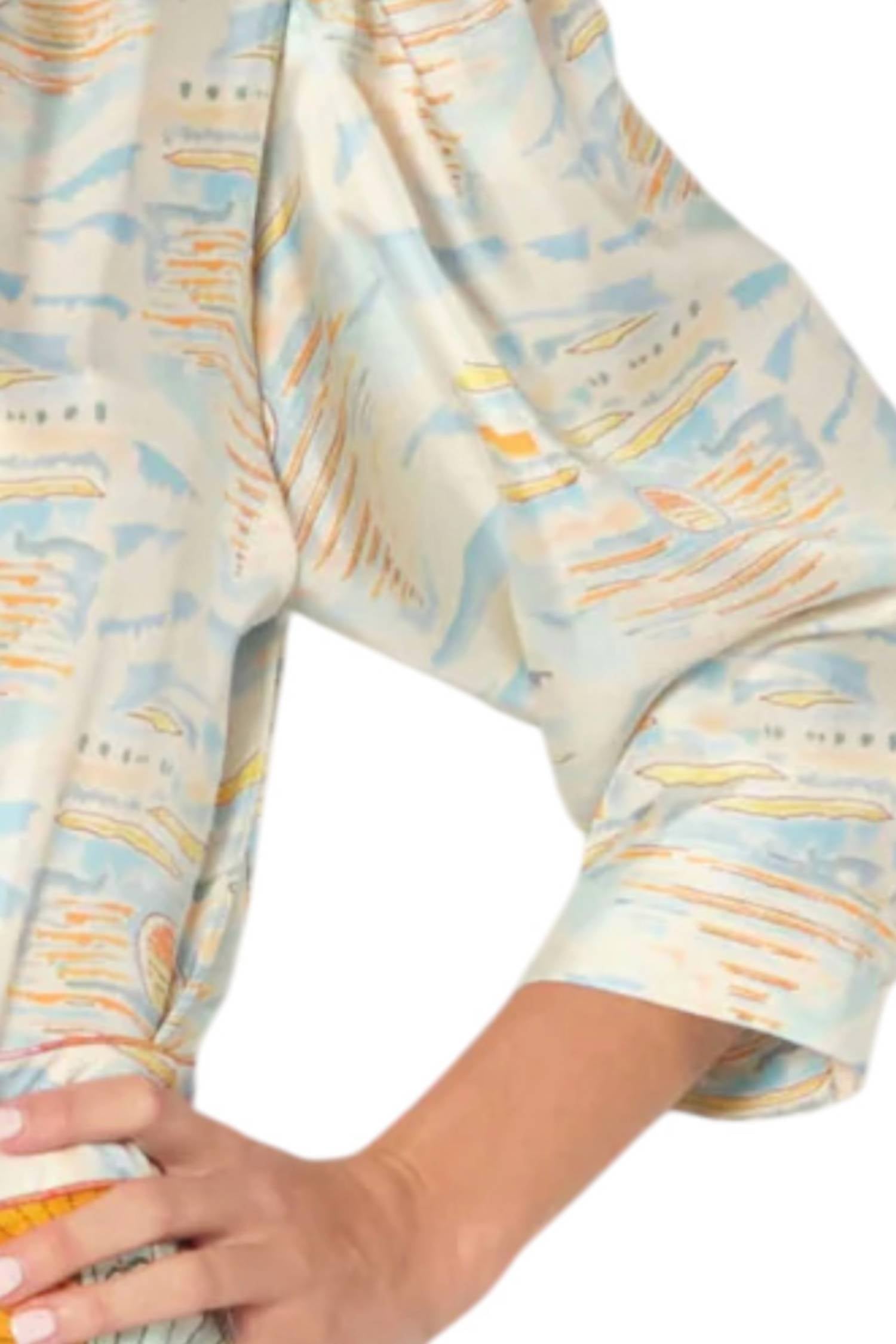 A timeless blouse that will never go out of style. Introducing the Mona Shirt by LA PRESTIC OUISTON, a boho chic statement piece ideal for a sophisticated dinner party. This patterned silk blouse features a Mao collar and three-quarter balloon sleeves, with a unique LPO exclusive "L.A. SUNSET CIEL" print. Crafted from 100% silk, it includes Mother of Pearl buttons for elegant closure. Made for women seeking luxurious style, this blouse requires dry cleaning to maintain its exquisite quality.