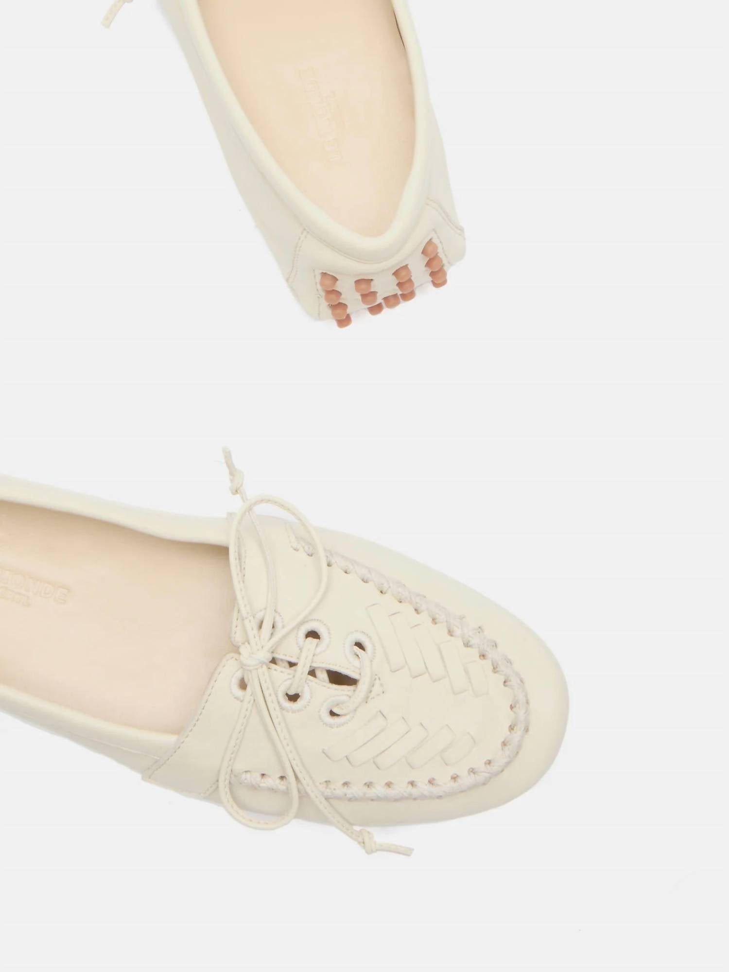 Introducing the Women's Driver Moccasin by Le Monde Béryl, a chic choice for both work and travel. Crafted in Italy, these moccasins feature elegant ecru calf leather with exquisite embroidery on the toe and a comfortable cushioned calf leather insole. They boast a flat rubber pebble sole and an 8mm heel, designed for effortless sophistication. Elevate your summer wardrobe with this versatile piece, perfect for Easter celebrations or any stylish getaway.