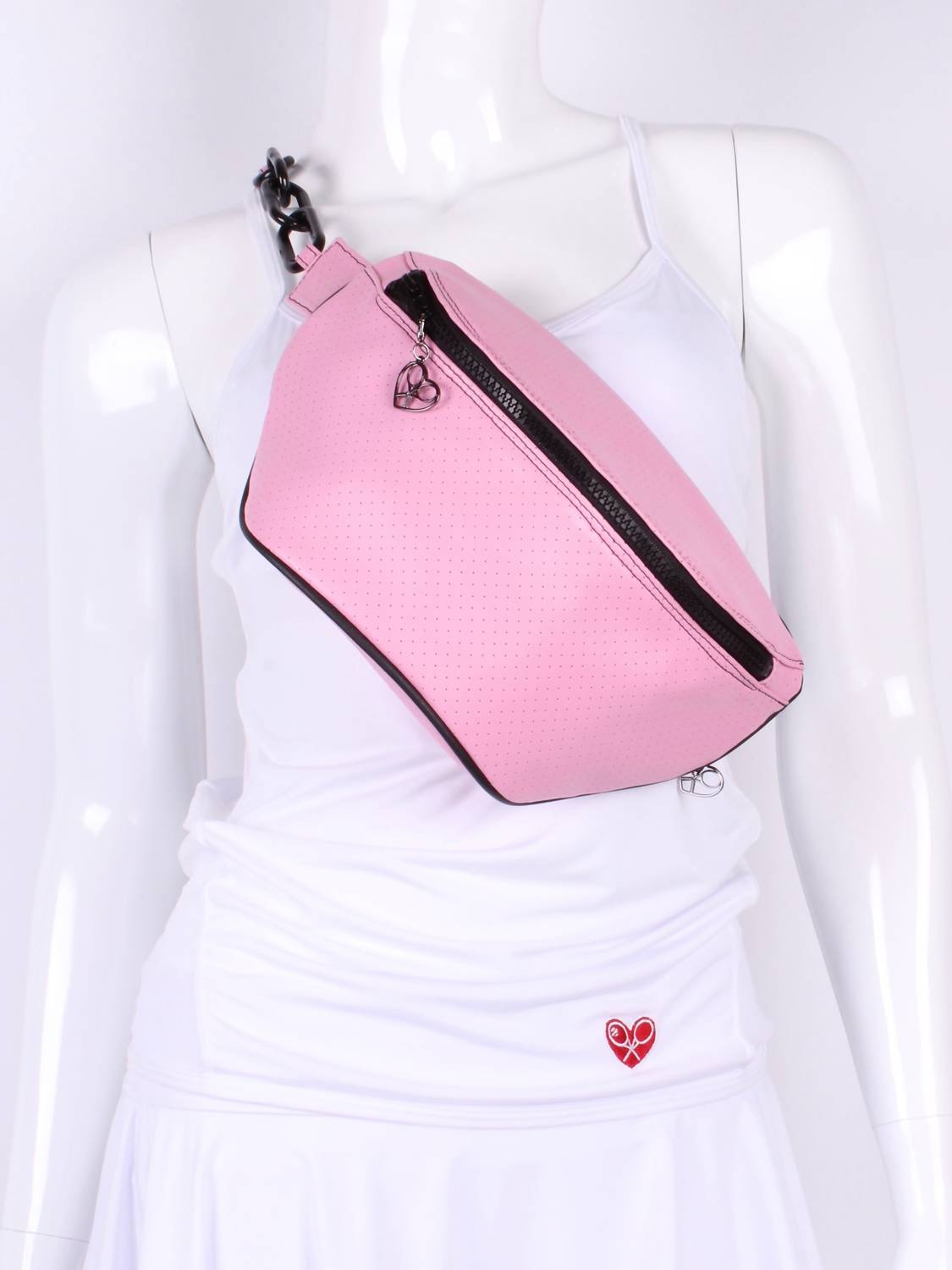 This crossbody bag will be your go-to bag of the season. The Women's Bum Bag by Love Love Tennis is a chic and functional accessory for the modern woman. Handcrafted with love in Downtown Los Angeles, this limited edition bag offers a perfect blend of luxury and practicality. Made from soft, durable vegan leather, it features a divided interior lined with coordinating ILMDP fabric and an exterior back zip pocket for added convenience. The matt black belt closure adjusts to fit hips from 34" to 46", making it versatile to wear as a crossbody.
