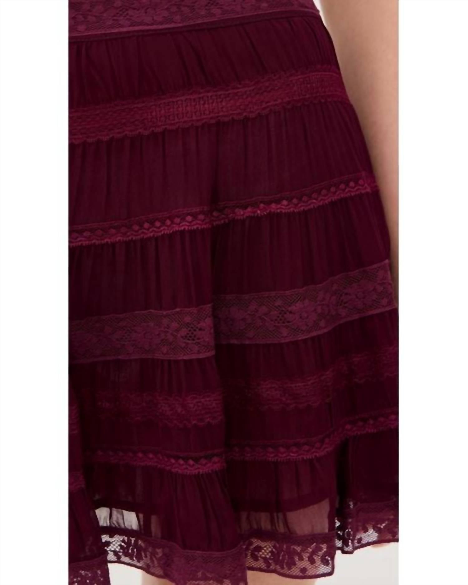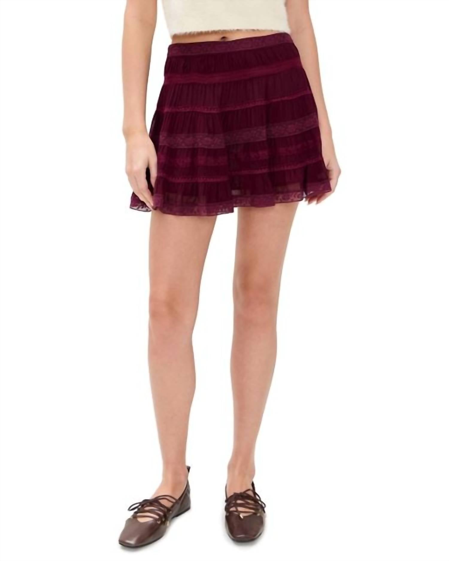 Show just the right amount of leg in this fit flattering mini. Step into style with the LoveShackFancy Fleetta Skirt in rich maroon, a perfect addition to your summer wardrobe. This women's mini-length skirt features a romantic tiered design crafted from 100% viscose, showcasing a flattering silhouette with textured details. Originating from an undisclosed country, the lined skirt is completed with a convenient side zipper closure. Care for this boho chic piece by opting for dry cleaning only. Model Allie, standing at 5'7", is wearing a size small.