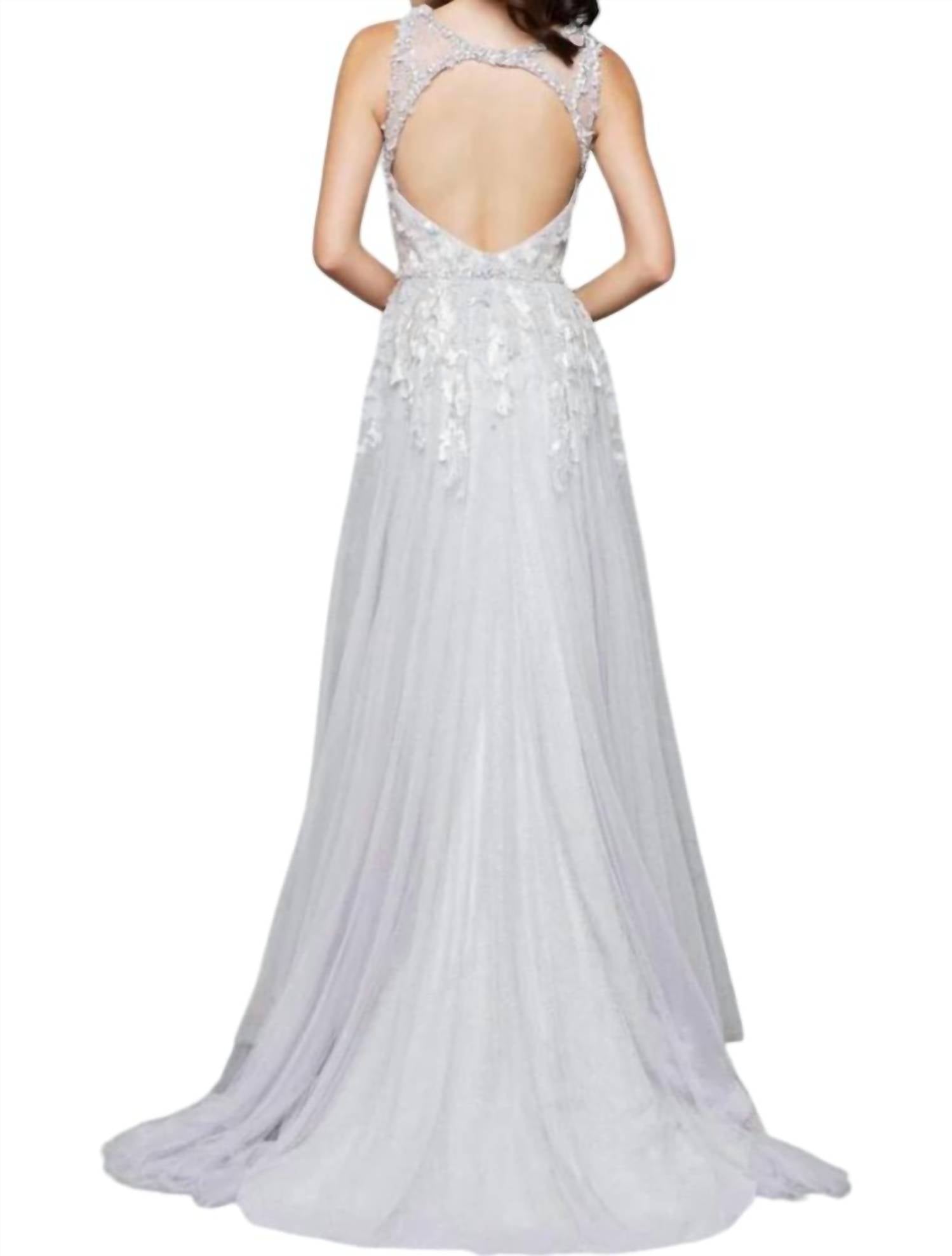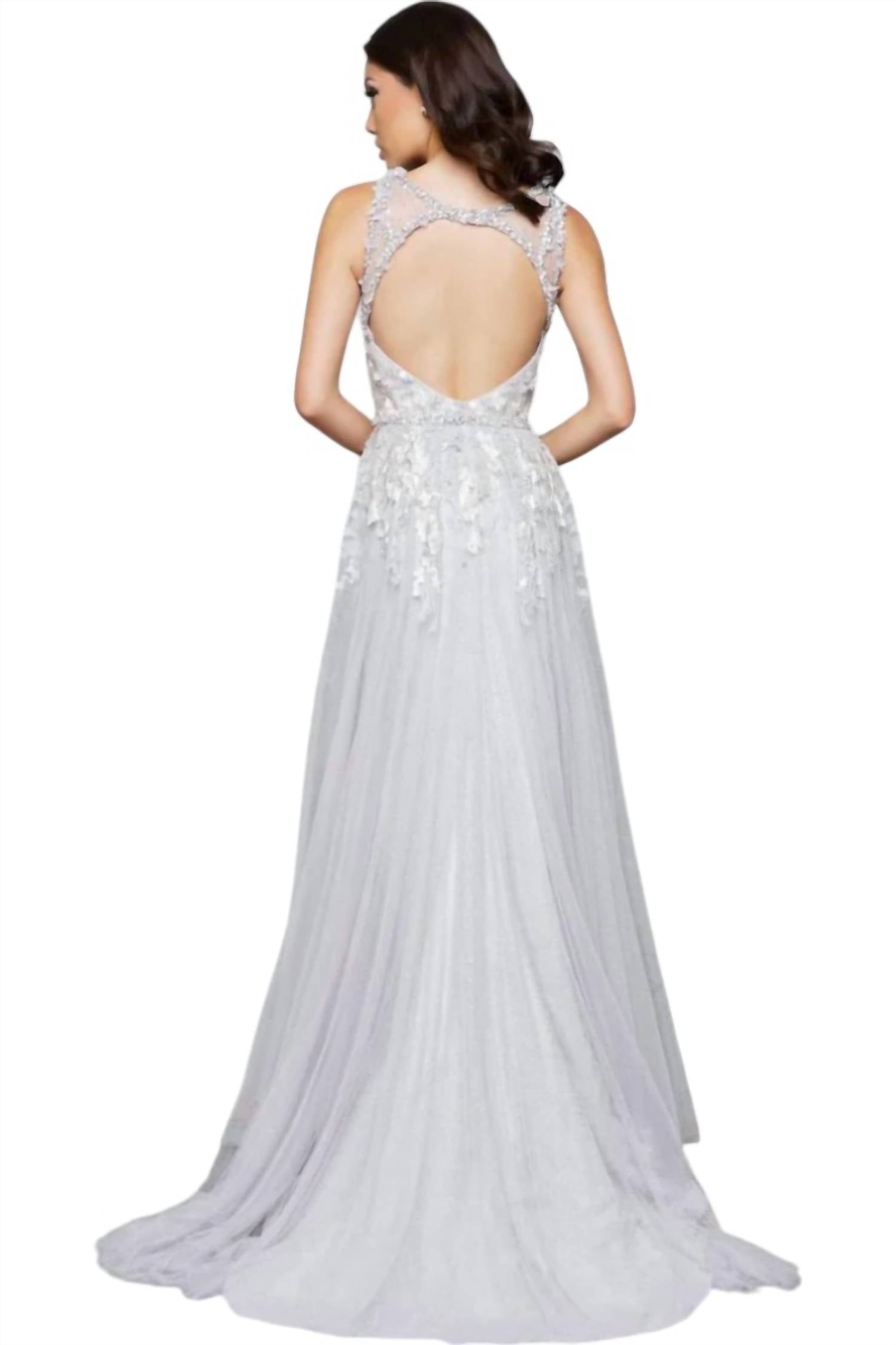Just add a cute little clutch and a matching heel for the perfect event look. Unveil elegance perfect for prom night or any special occasion. Platinum, sleeveless masterpiece features an A-line silhouette. Stunning crewneck, beautifully adorned with a beaded belt and beaded appliqué. Embroidered gauze mesh skirt flows to a graceful floor length. Ensuring a captivating entrance. Dry clean only.