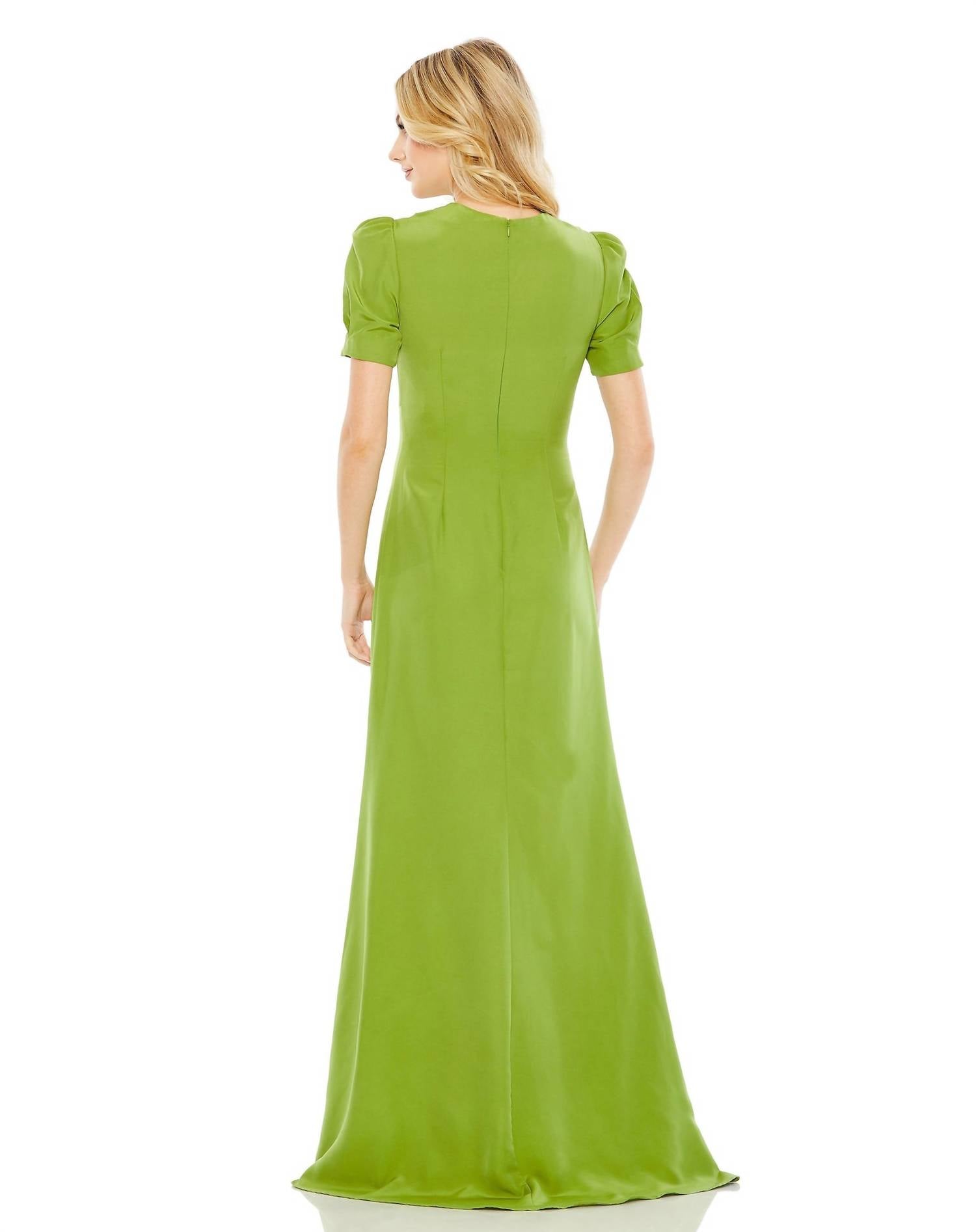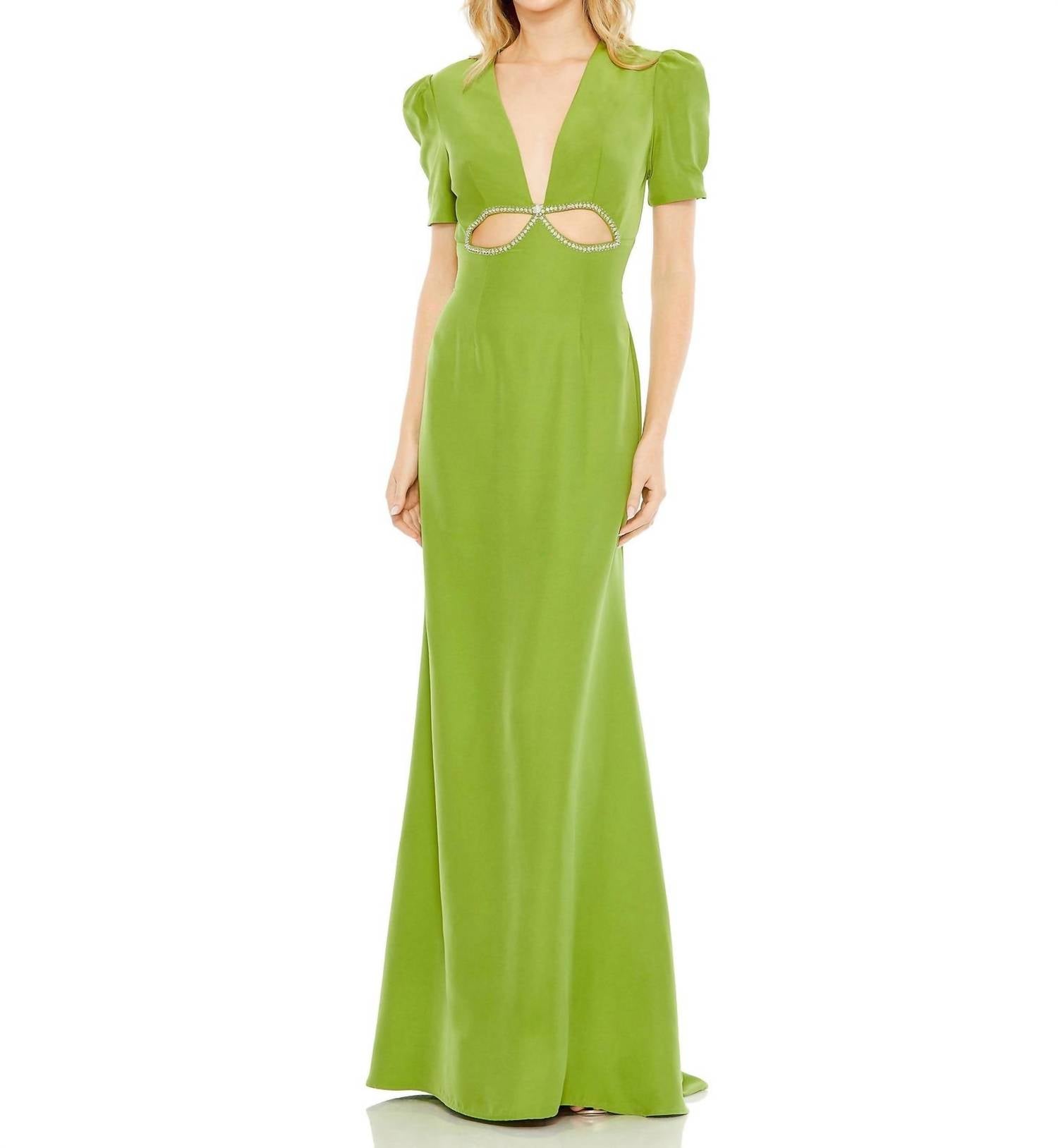 Style this maxi with your favorite statement necklace and sandals for the perfect look. Introducing the Mac Duggal Plunge Neck Puff Sleeve Cut Out Gown, a stunning piece perfect for making a statement at evening events. This gown features short puff sleeves and is crafted from luxurious polyester, offering a sophisticated fit and flare silhouette in a striking apple green. The maxi-length design elegantly complements the plunging neckline, accentuated by intricate beaded detailing and a chic cut-out bodice. Originating from the Mac Duggal brand, it ensures a flawless fit with a zip closure in the back, epitomizing quiet luxury and refined glamour.
