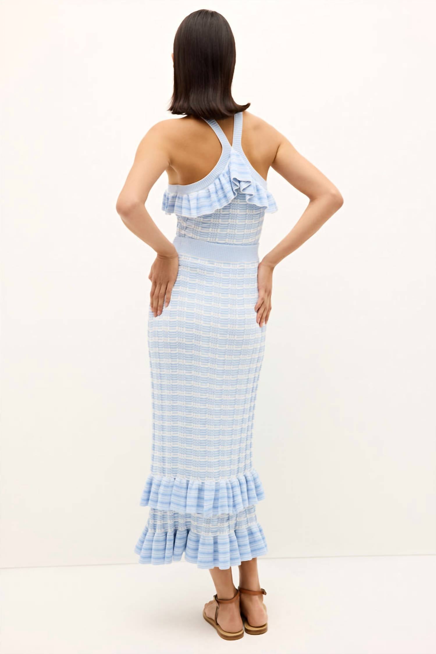 The midi length skirt is here to stay and we especially love this style. This body-skimming skirt features an elastic waistband and ruffle details, crafted from soft striped rib knit for a flattering fit. Made from 63% ecojilin viscose and 37% recycled nylon, it offers both comfort and style—perfectly paired with a matching halter-style top for a sophisticated, feminine look.