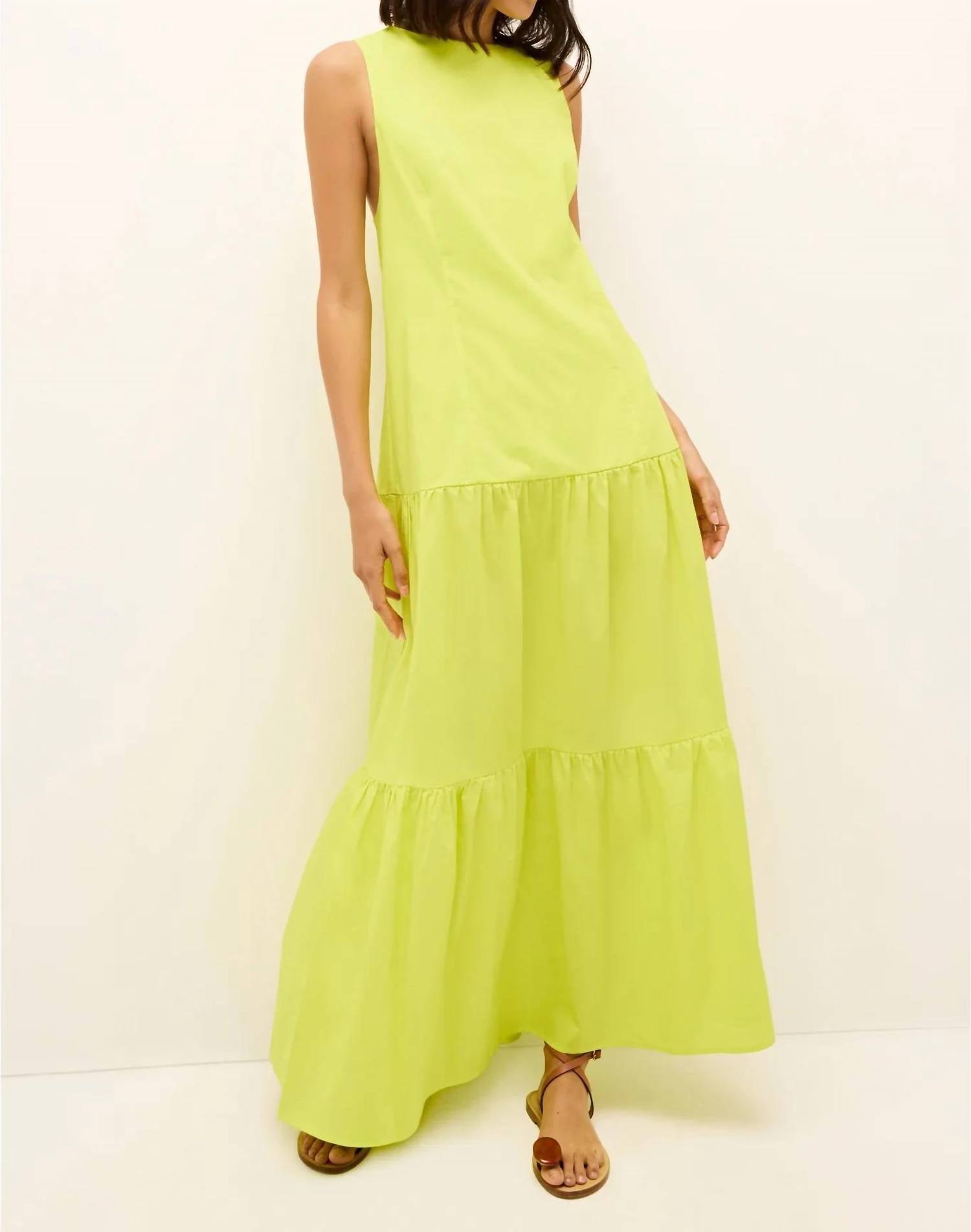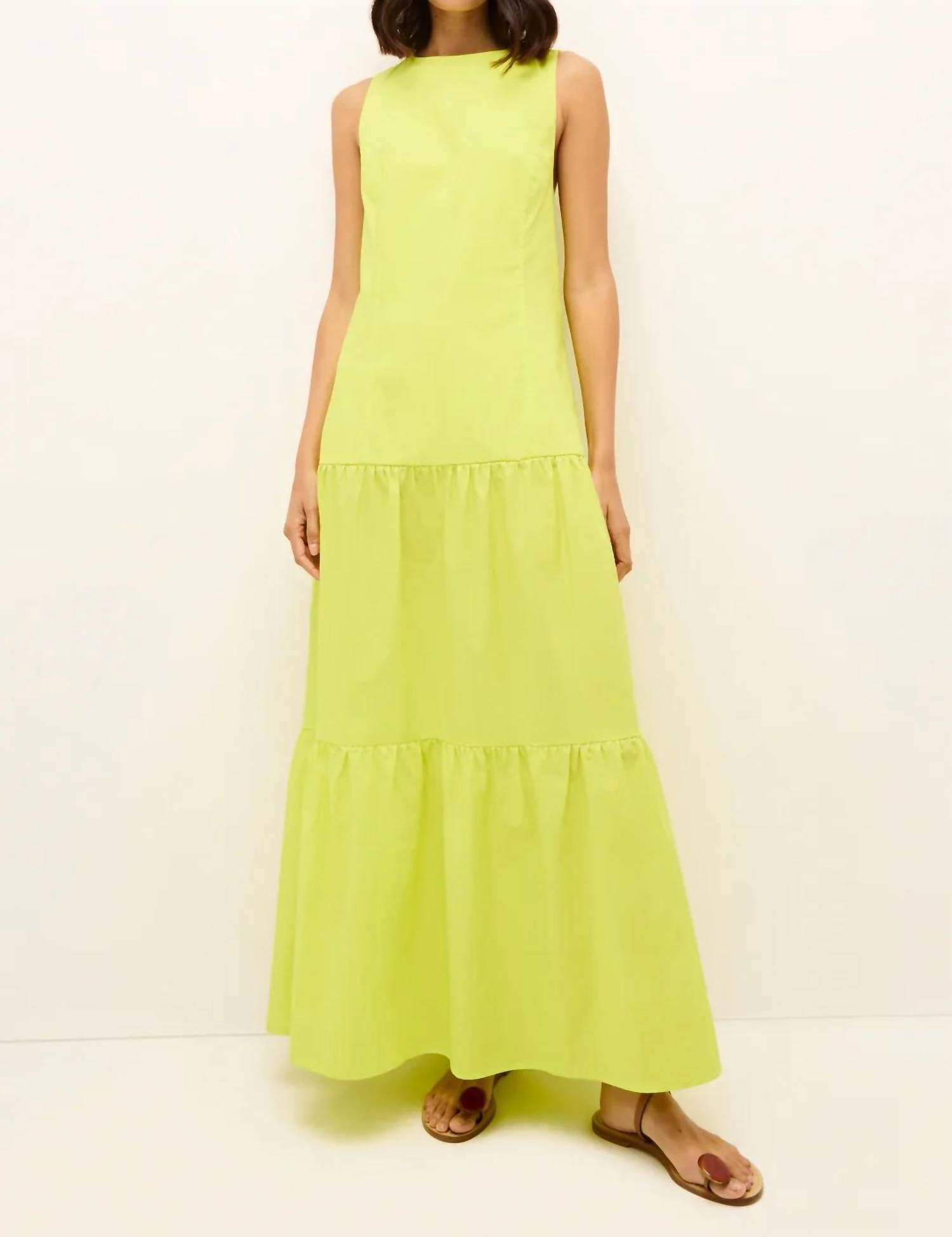 Who doesn't love a good maxi dress? This one you'll be reaching for season after season. Introducing the Zelda Dress by Marie Oliver, crafted for warm vacation vibes in vibrant Sunshine yellow. This sleeveless maxi dress, made from 100% cotton poplin, features an elegant drop waist and a stylish bow-back detail. It offers an effortless boatneck neckline and an A-line silhouette perfect for minimalist summer trends. Closure: Center back invisible zipper with hook and eye, plus keyhole ties. Care: Machine wash on a gentle cycle and line dry.