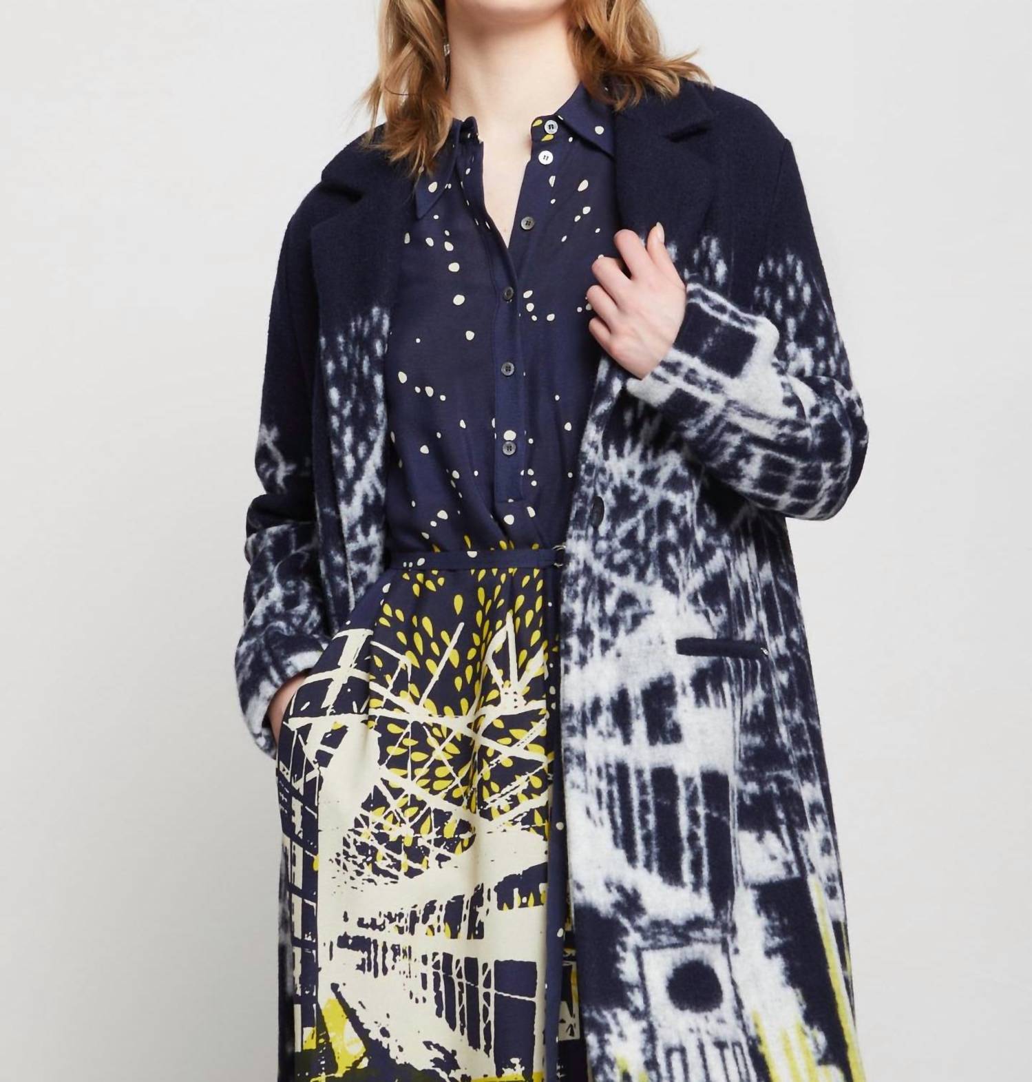 Introducing the Varunica Coat by Ottod'ame, a chic statement piece perfect for winter travels. This single-breasted trench coat in navy features long sleeves, a lapel collar, and is crafted from a graphic multicolor felt, adding a fashionable flair to any outfit. With practical multi pockets and a button closure, it seamlessly combines style with functionality. Care for this piece with ease through dry cleaning.