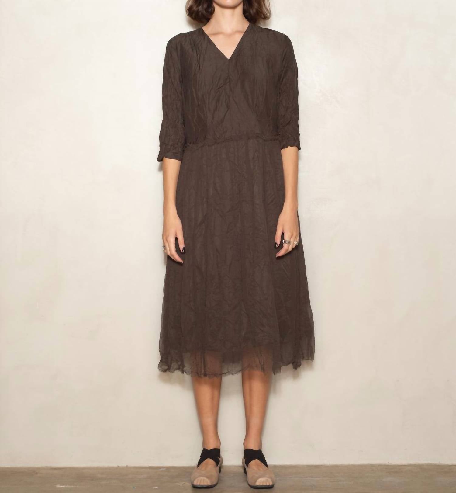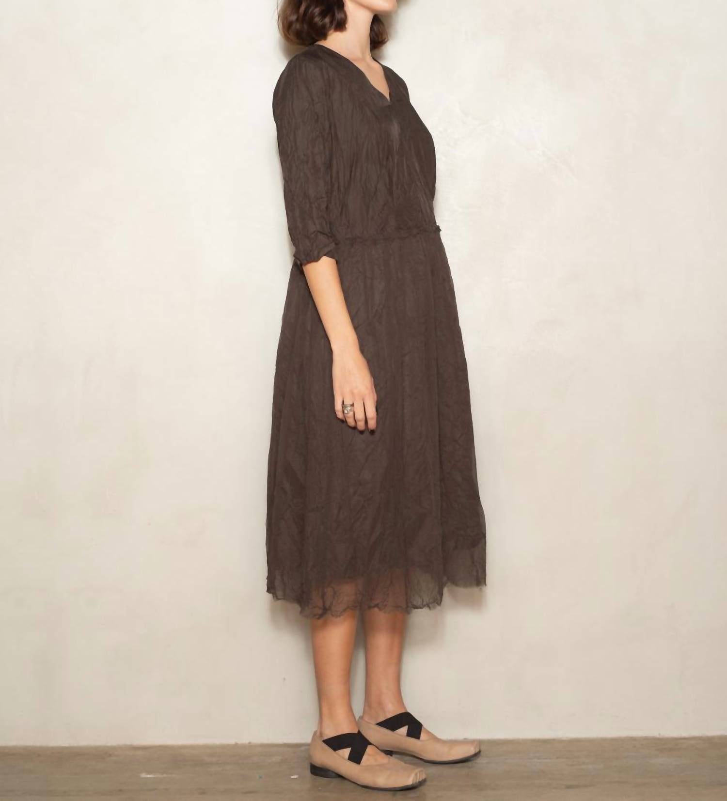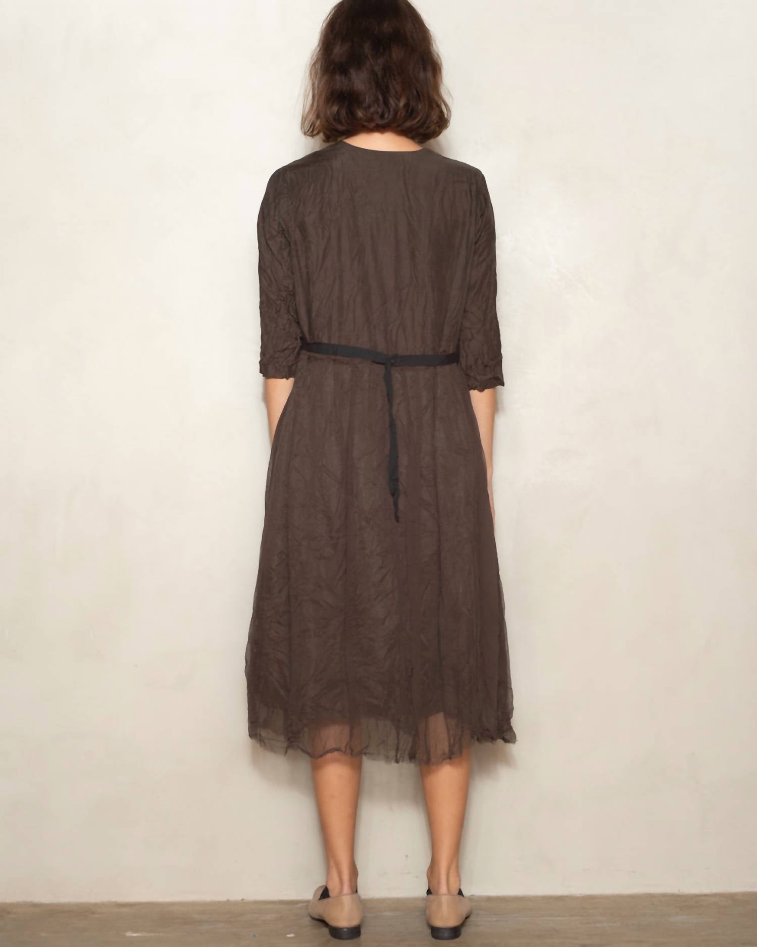 The perfect length dress does exist. Introducing the Cotton Cupro V-neck Dress by Pas de Calais, a masterpiece of understated elegance in a rich brown hue. This A-line midi dress features three-quarter sleeves in a cotton blend, with the upper body comprising 55% cupro and 45% cotton for a subtle sheen, while the full cupro chiffon skirt effortlessly flows to a raw hem. Crafted in Japan, this dress is designed with a pull-on closure for simplicity and style, making it suitable for both workwear and vacation outfits. Care is simple with a hand wash recommendation, ensuring this textured piece remains a cherished part of your fall wardrobe.