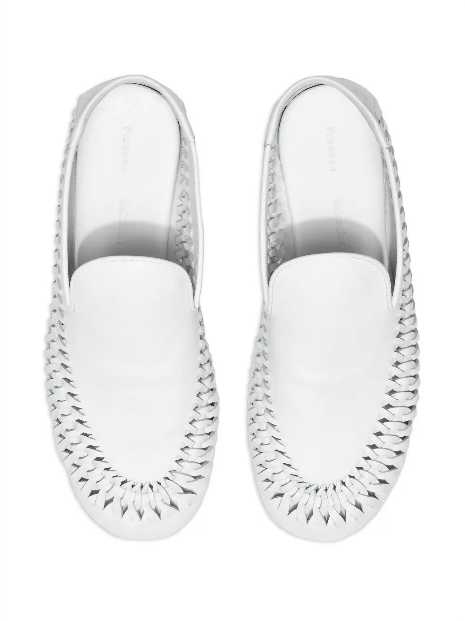 A classic loafer that is both comfortable and polished. Step into sophistication with the Women's Whip Loafer by Proenza Schouler, designed in a chic ecru color. These flats feature a soft leather upper, accented by intricate weave stitching, and rest on a monogram-embossed two-pod rubber sole for added style and comfort. Crafted in Italy, they boast a round toe with a minimalist flat heel, perfect for any engagement or Thanksgiving gathering. Ideal for the modern woman, these loafers are a seasonal staple for chic, understated elegance.
