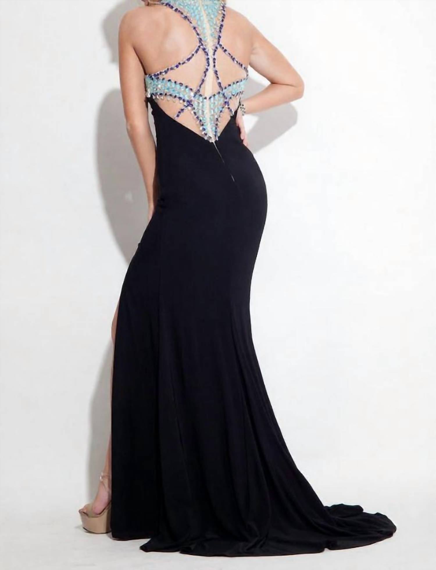 Turn heads in the cutest and most flattering evening dress. Discover the Halterneck Jersey Evening Gown by RACHEL ALLAN, an enchanting choice for your next evening event. This sleeveless full-length gown is designed in a chic black patterned jersey, featuring a high slit for dramatic elegance. With a stylish sheath silhouette, it ensures a flattering fit, complemented by a sleek halter neckline. Closure is a zip closure.