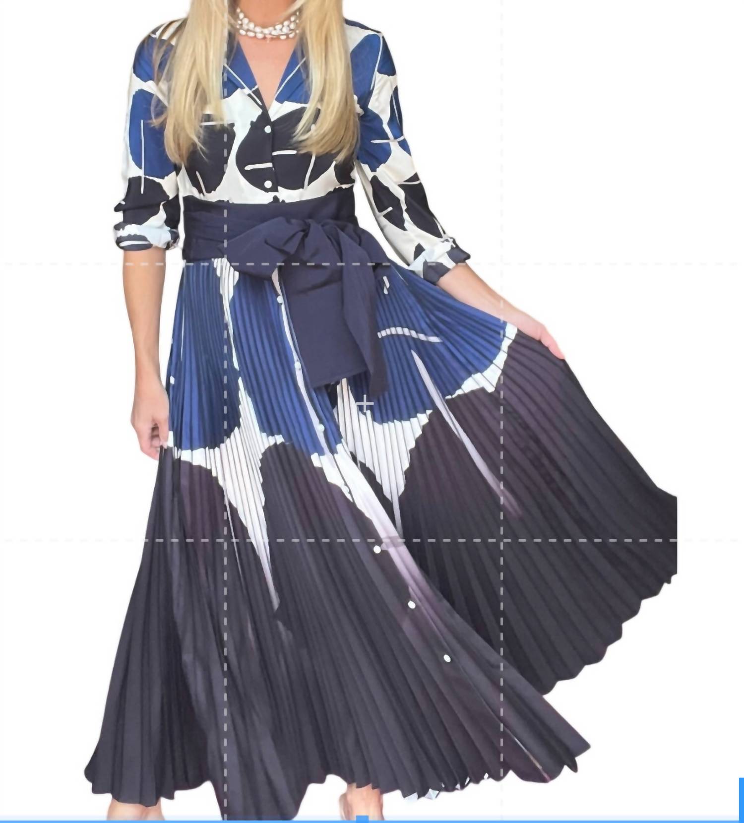 Gorgeous long dress that you can twirl in all night. Blue and black geodot pattern. Button down shirt. Pleated bottom.