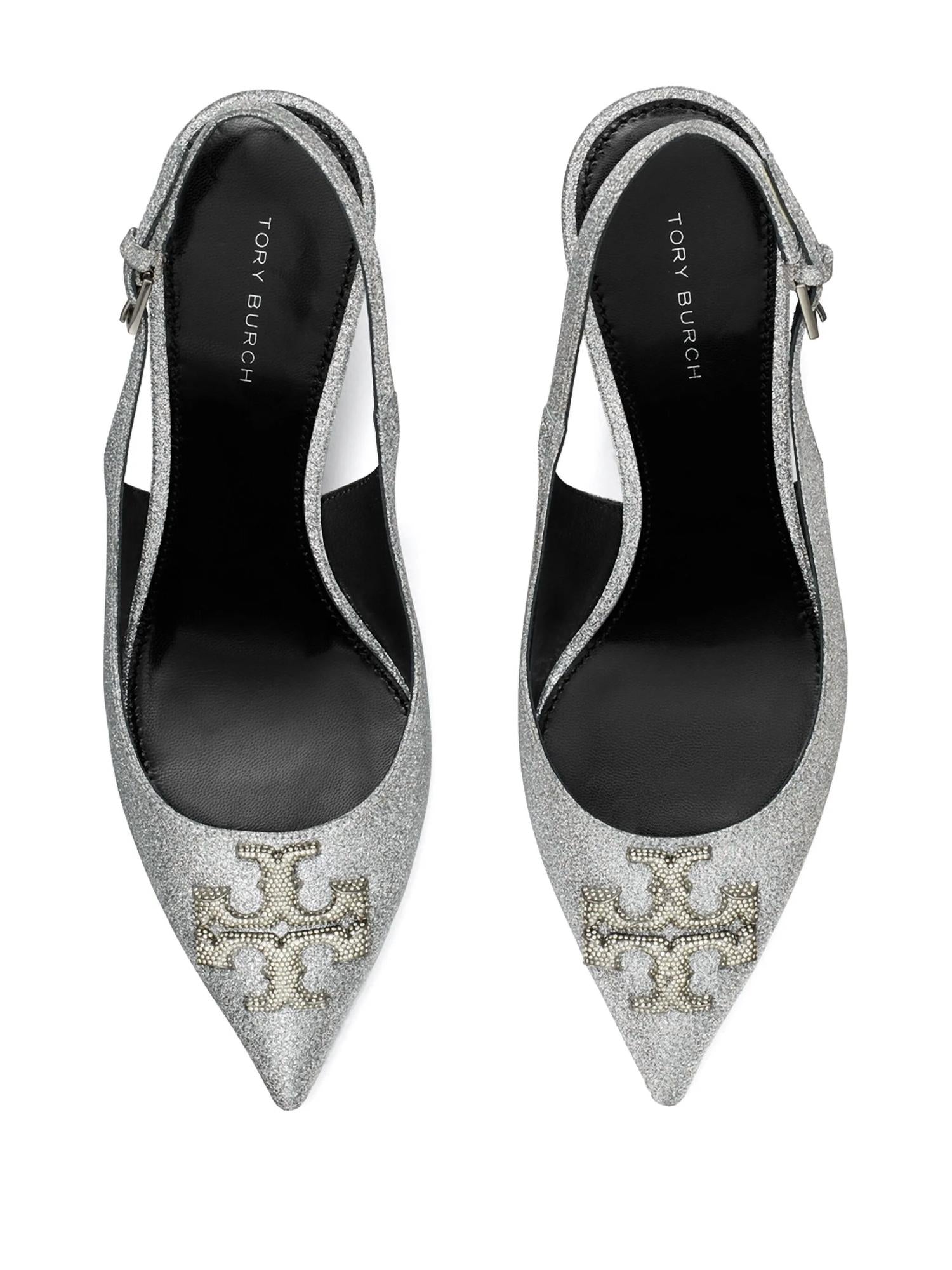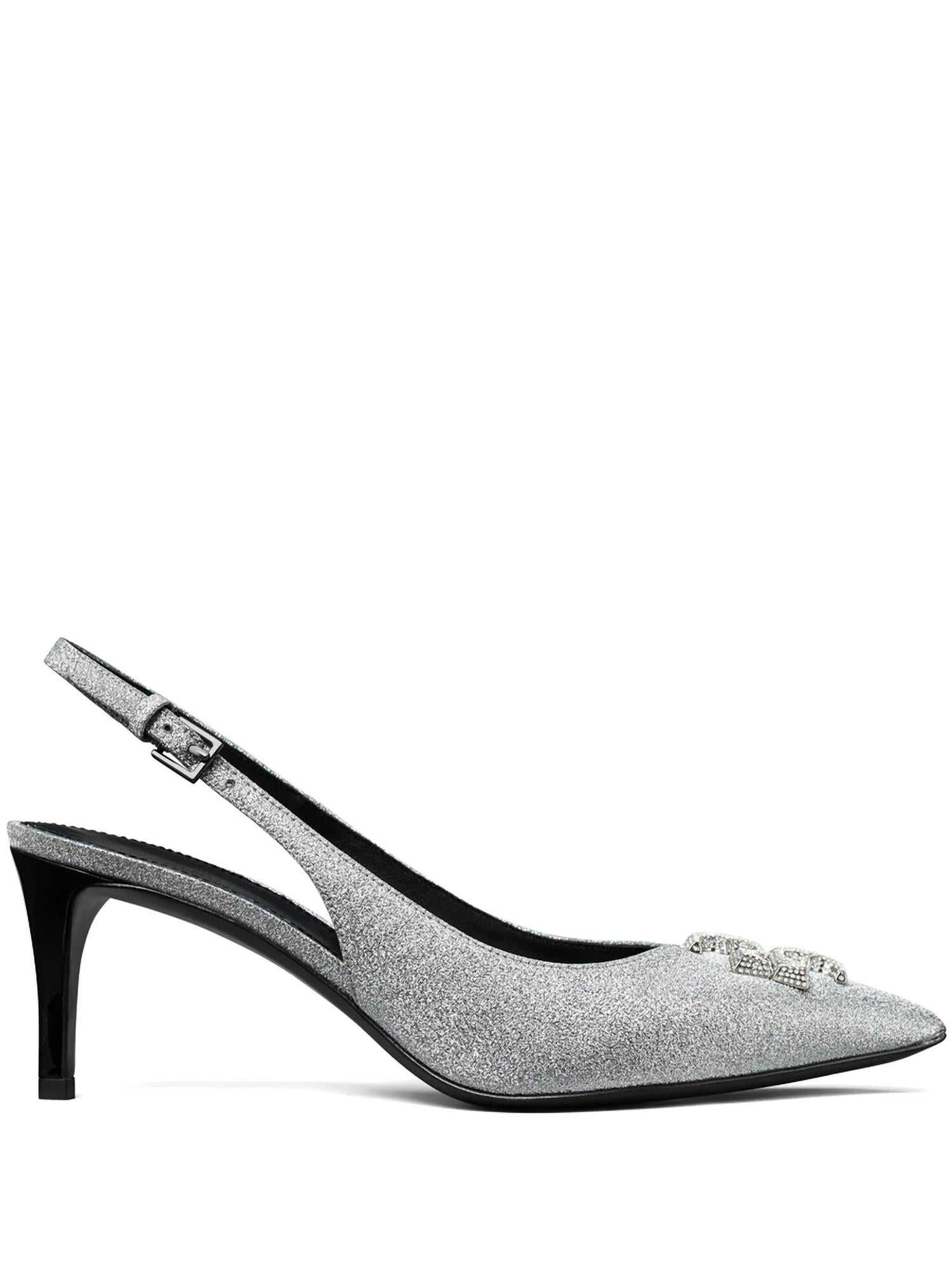 The Tory Burch 65mm Eleanor pave slingback pumps feature a striking silver-tone design with glitter detailing and crystal embellishments, including a pavé-set crystal Double T motif at the front. The pumps have a pointed toe, a buckle-fastening slingback strap for a secure fit, a high stiletto heel measuring approximately 65mm, and a branded leather insole for comfort. Crafted from 100% calf leather for the sole and lining, with the outer composed of metallic leather and glitter, these pumps combine ornate detailing with premium materials for an elegant look.