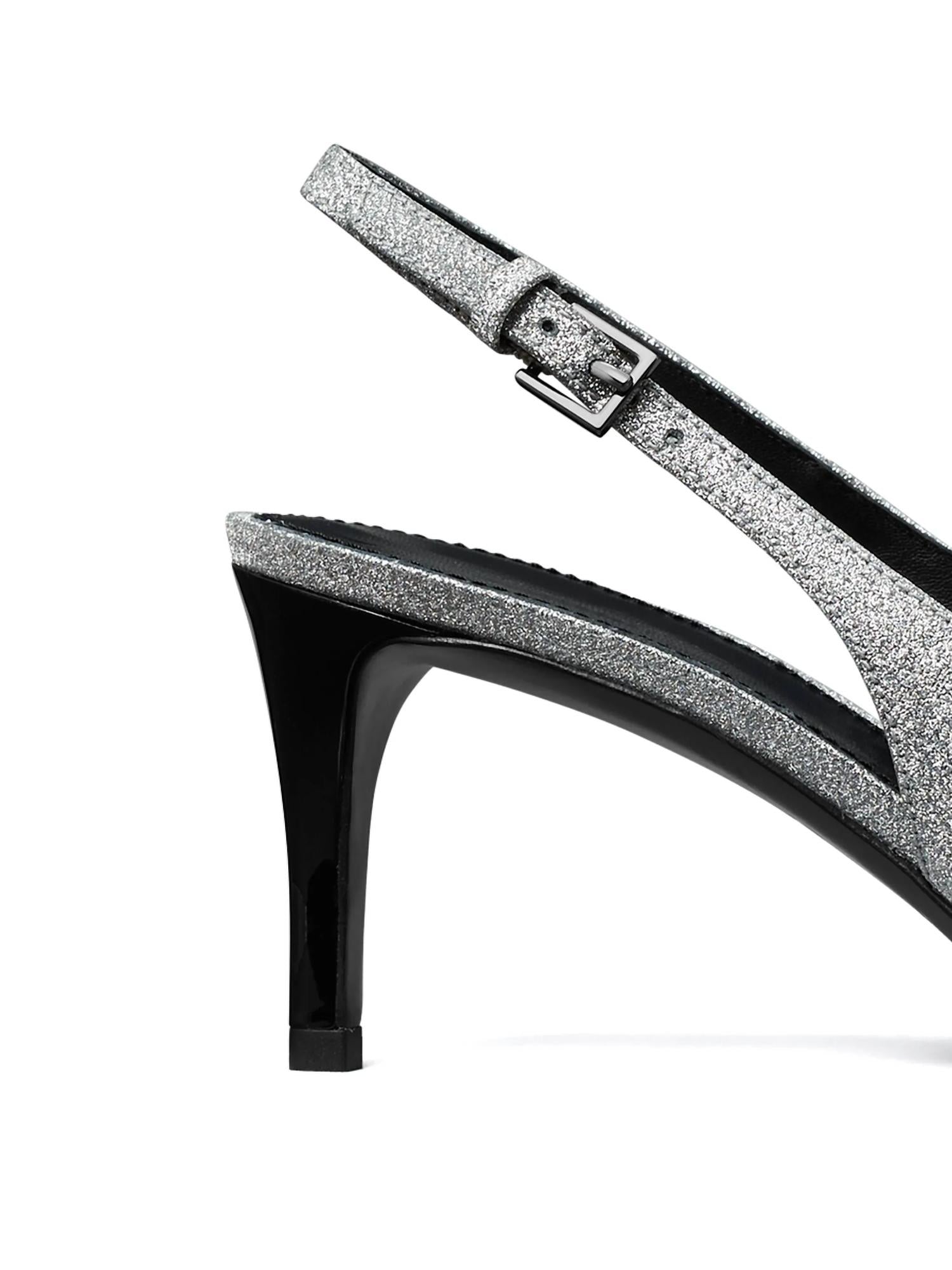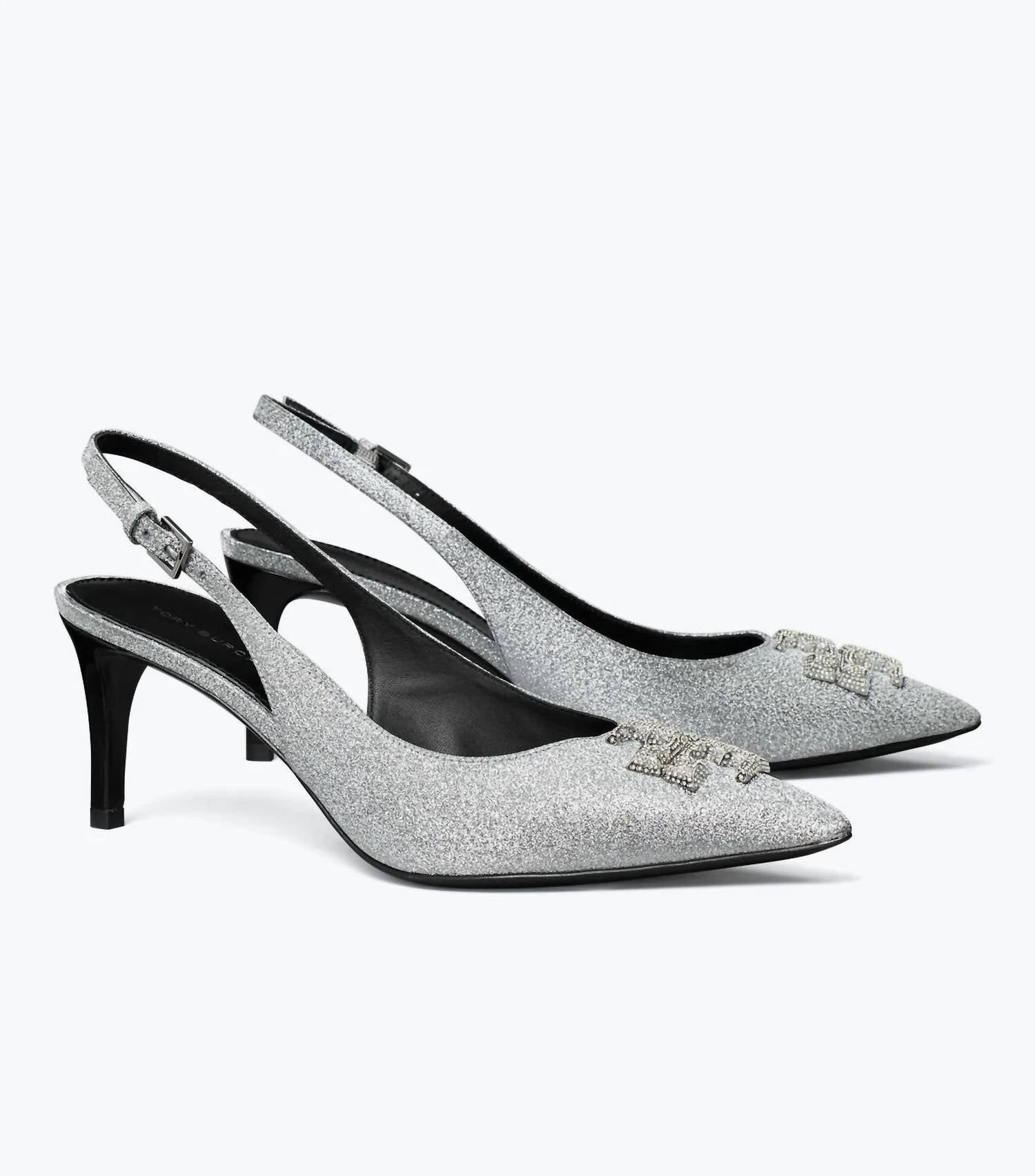 Don't be deceived, these heels are comfy as can be. The Tory Burch 65mm Eleanor pave slingback pumps feature a striking silver-tone design with glitter detailing and crystal embellishments, including a pavé-set crystal Double T motif at the front. The pumps have a pointed toe, a buckle-fastening slingback strap for a secure fit, a high stiletto heel measuring approximately 65mm, and a branded leather insole for comfort. Crafted from 100% calf leather for the sole and lining, with the outer composed of metallic leather and glitter, these pumps combine ornate detailing with premium materials for an elegant look.