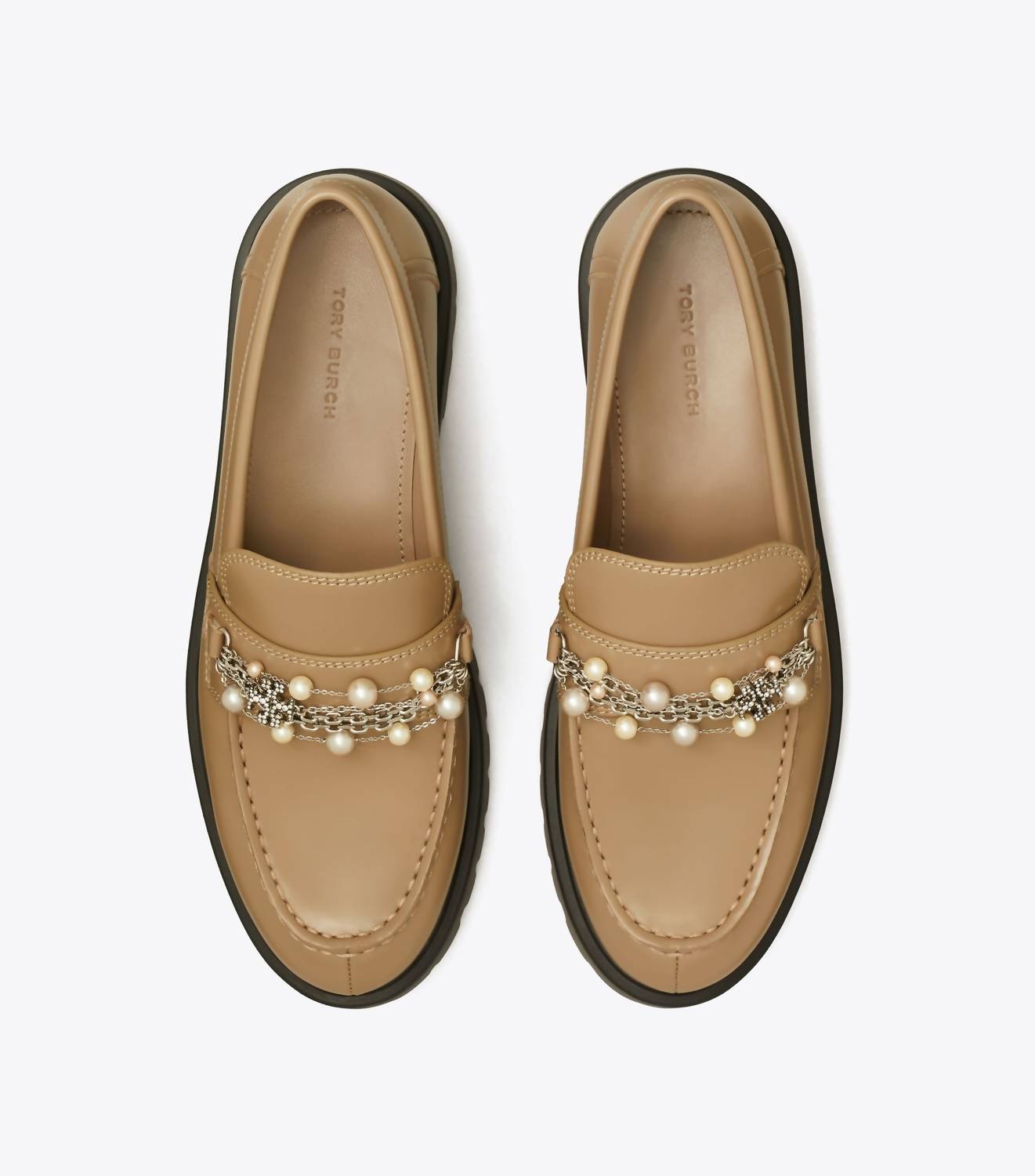 TORY BURCH presents the Women's Footwear Classic Embellished Lug Loafer in a chic Dark Elk hue, perfect for both workwear and holiday parties. Crafted from luxurious leather with a chain embellishment, these loafers feature a pull-on closure and a stylish lug sole. Designed in the USA, they offer a comfortable medium width and a modern flat chunky heel, ideal for all-day wear. Please note that these loafers are not water-resistant, making them best suited for dry, summer days.