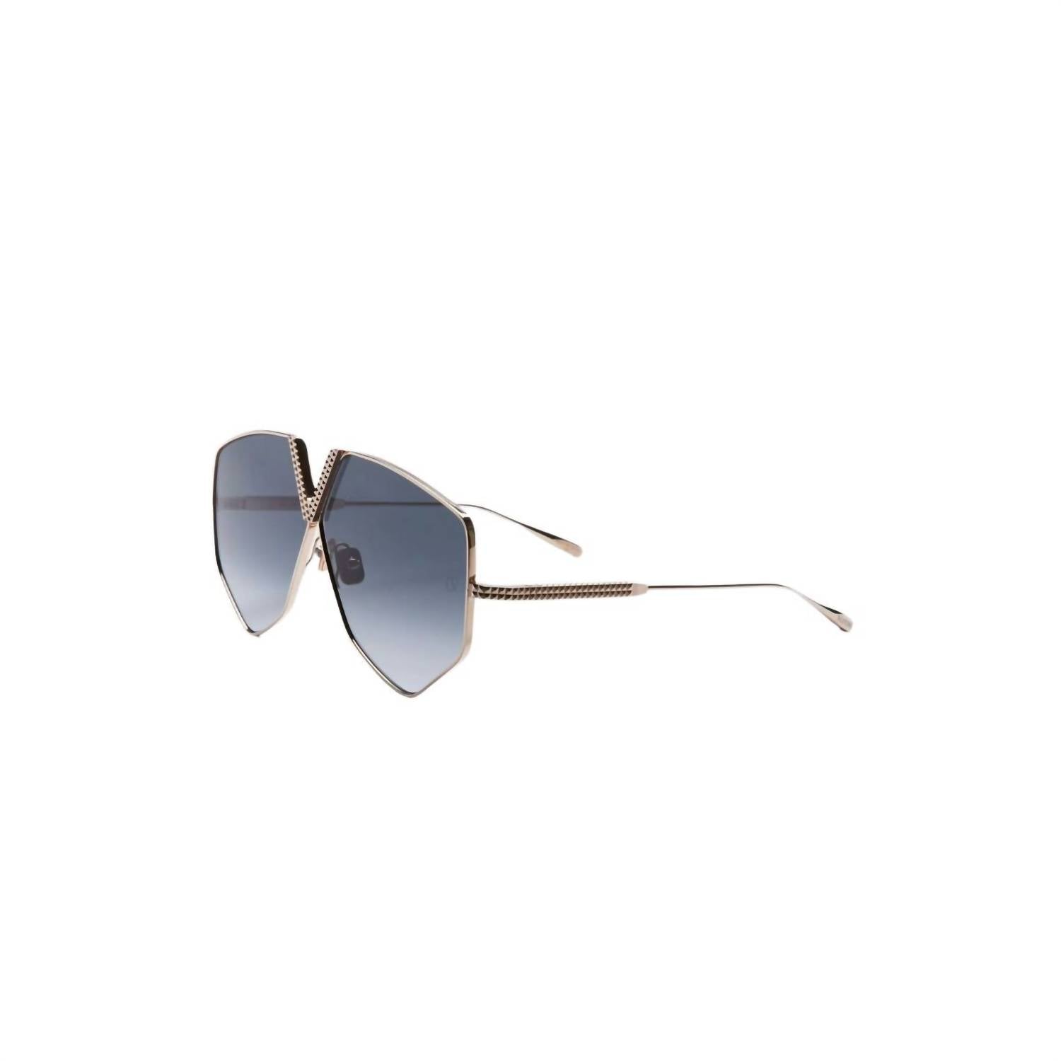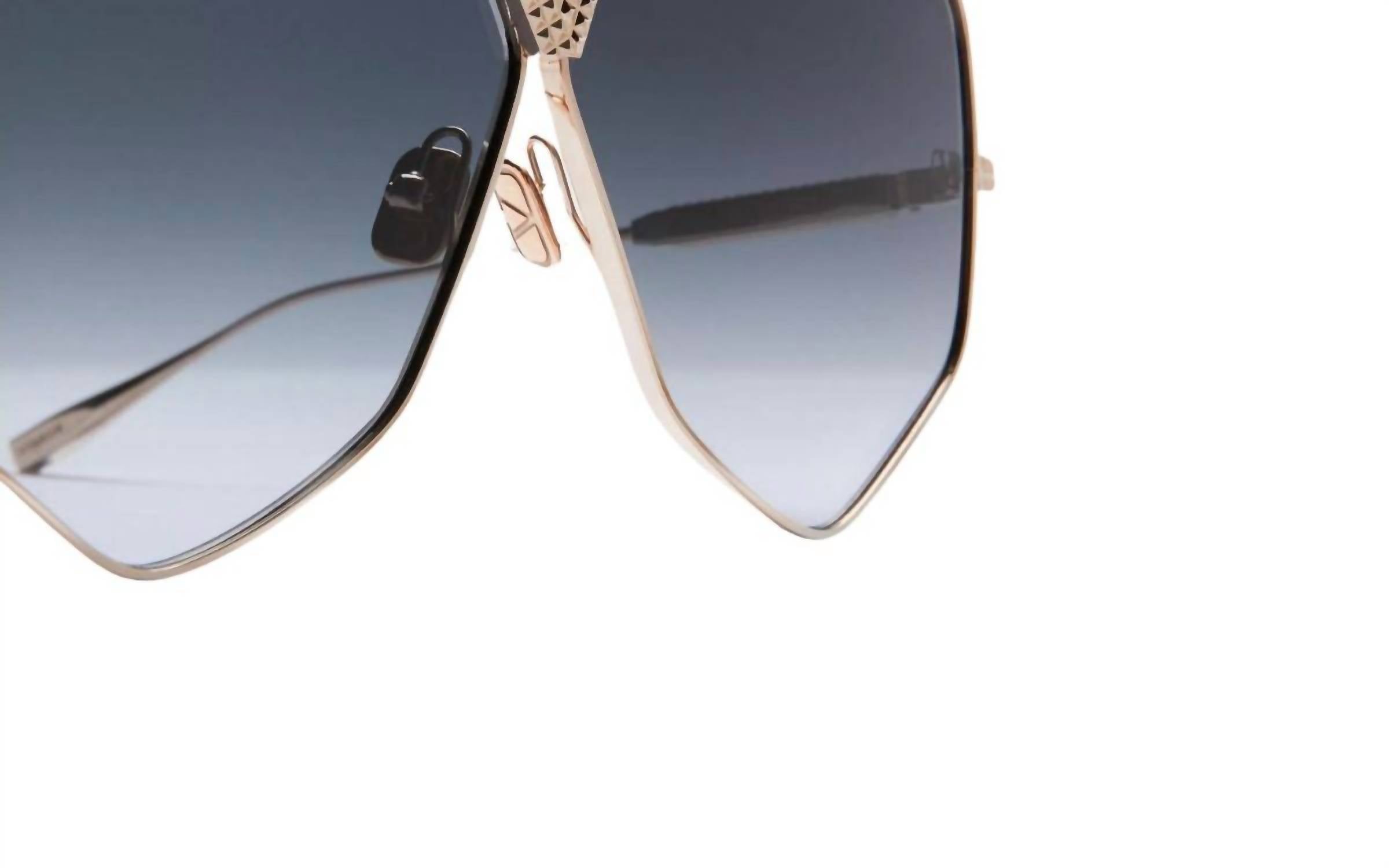 Make a statement and shield your eyes in these fashionable, yet practical sunglasses. Grab these adorable shades for your next vacation and elevate your accessory game. Introducing the Valentino Garavani V-Hexagon Sunglasses, a striking accessory in Gradient Grey that captures the elegance of the brand. These sunglasses showcase oversized aviator lenses, crafted from high-quality titanium for durability and style. With a distinctive V-logo bridge, they reflect a signature look inspired by Valentino's legacy. Precision-crafted in Japan, these sunglasses epitomize sophistication and artistic flair.
