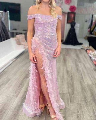 Vienna Prom - High Slit Feathers Off-the-shoulder Long Party Dress
