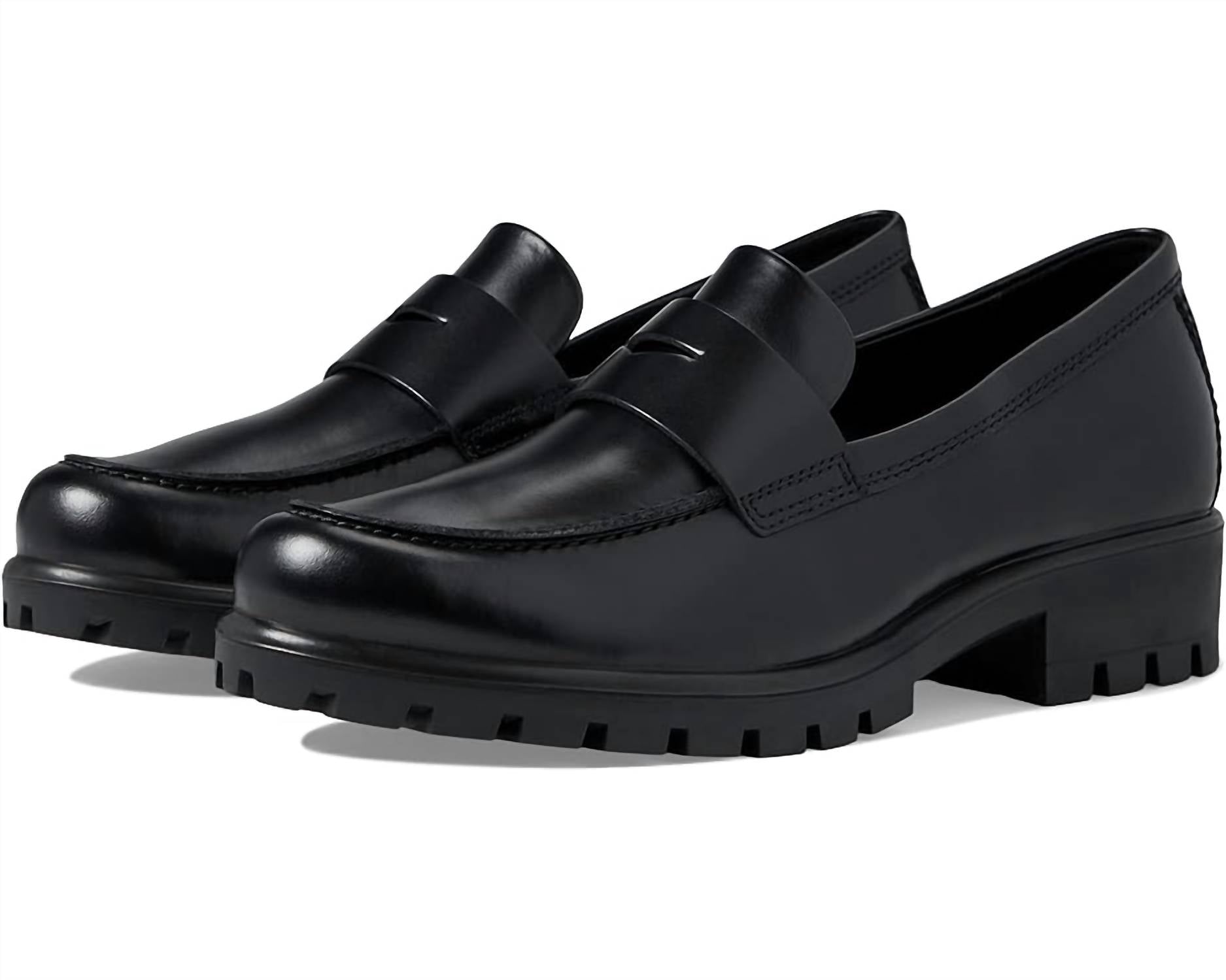 A preppy yet feminine take on the classic loafer. This moc-toe penny loafer brings an edgy twist to a timeless silhouette, crafted from smooth full-grain leather with refined detailing. Set on a lightweight lugged sole for added height, it blends sophisticated street style with all-day versatility—perfect for both everyday wear and office-ready looks.