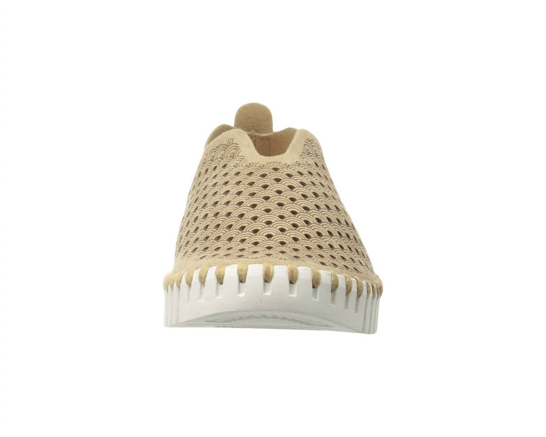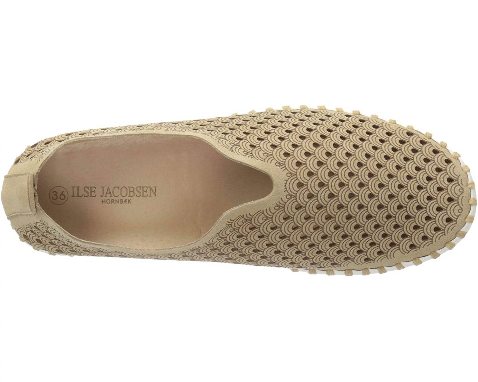 A preppy yet feminine take on the classic loafer. Discover the Women's Tulip 139 Shoe by Ilse Jacobsen in a chic Latte color, a testament to style and comfort. This minimalist flat boasts a recycled microfiber upper with a unique laser-cut pattern for breathability. Engineered with a flexible outsole crafted from natural rubber, it offers a practical, glue-free construction ideal for travel. Designed with a round toe and a flat heel under 1 inch, it's the perfect summer shoe for any church occasion.