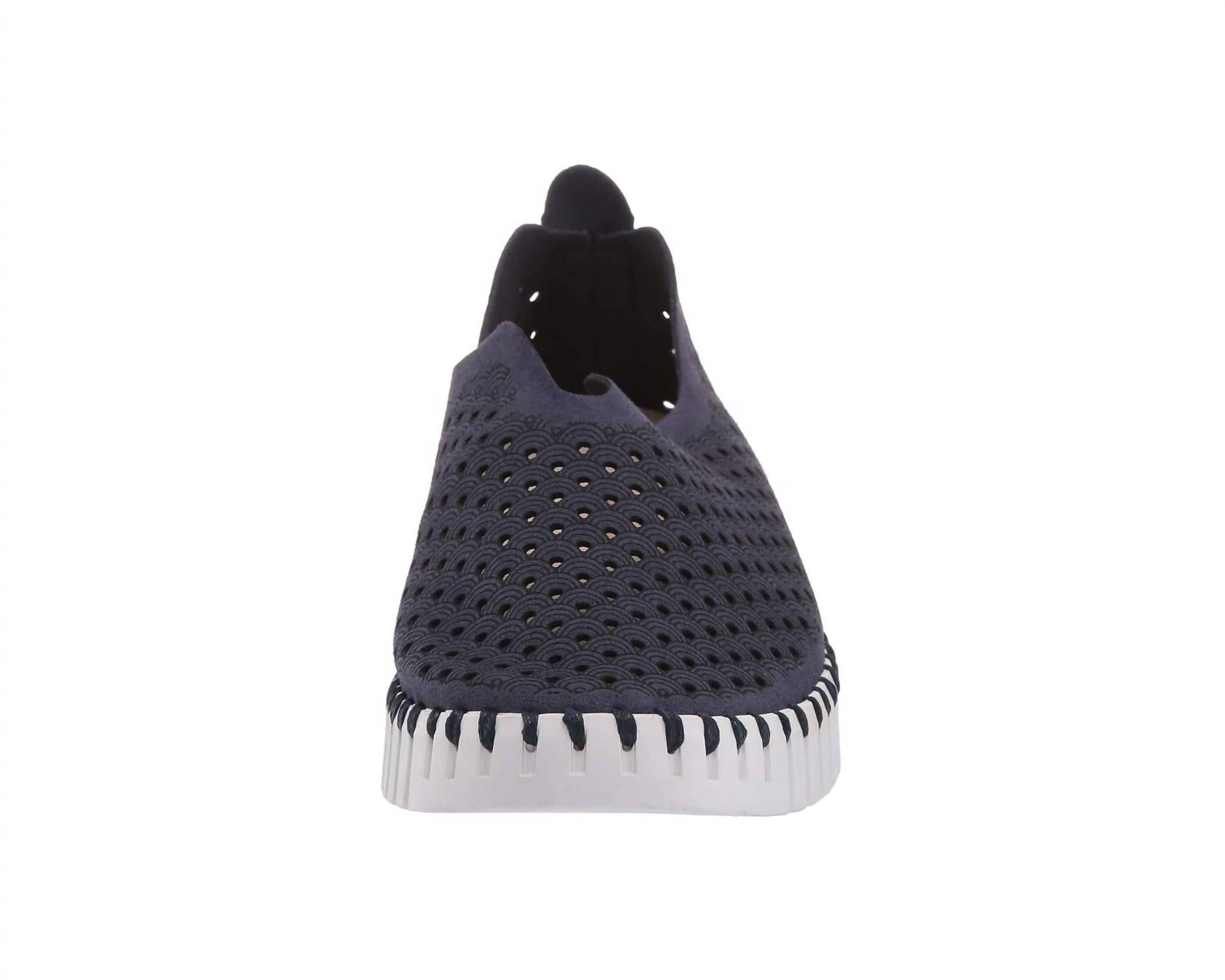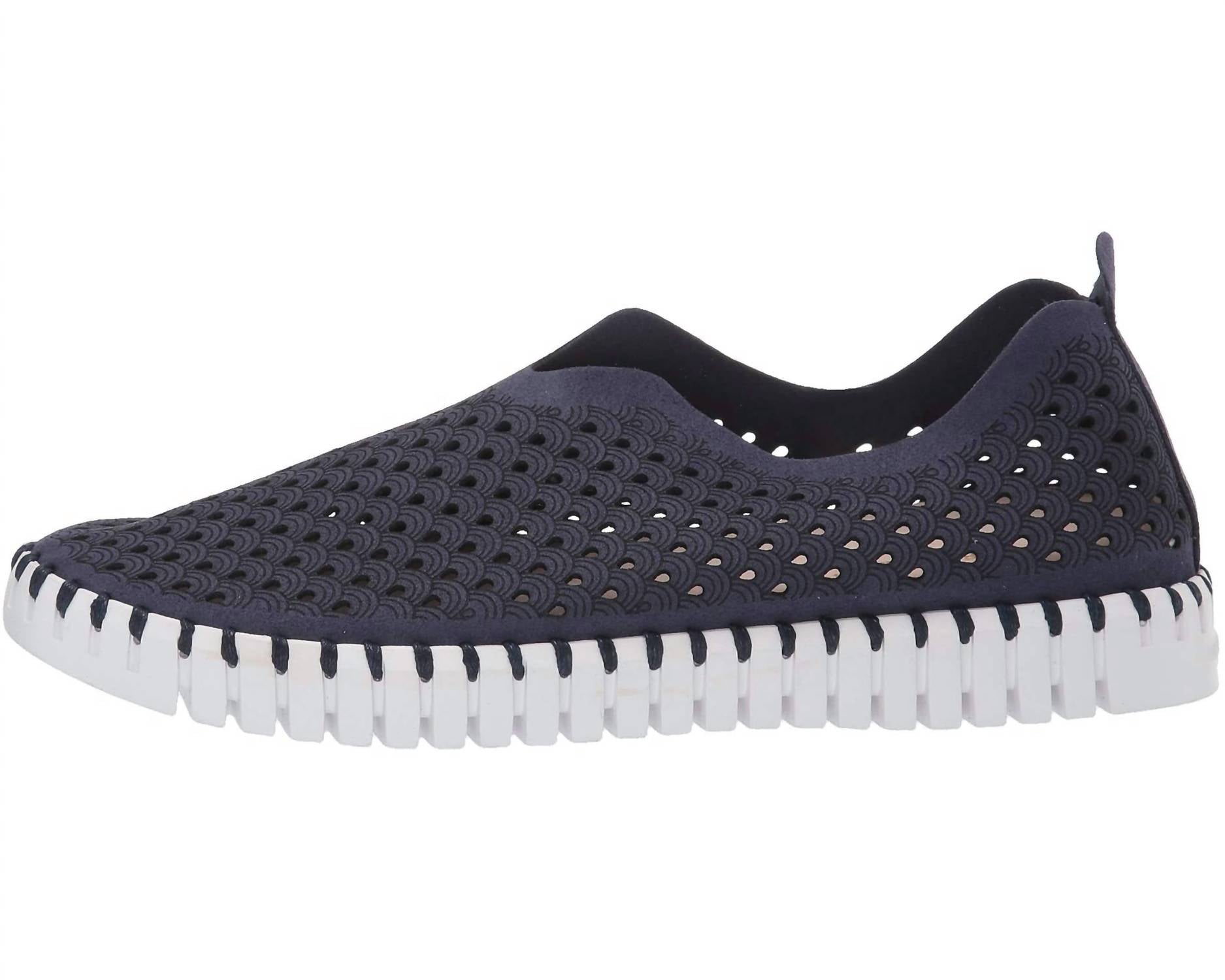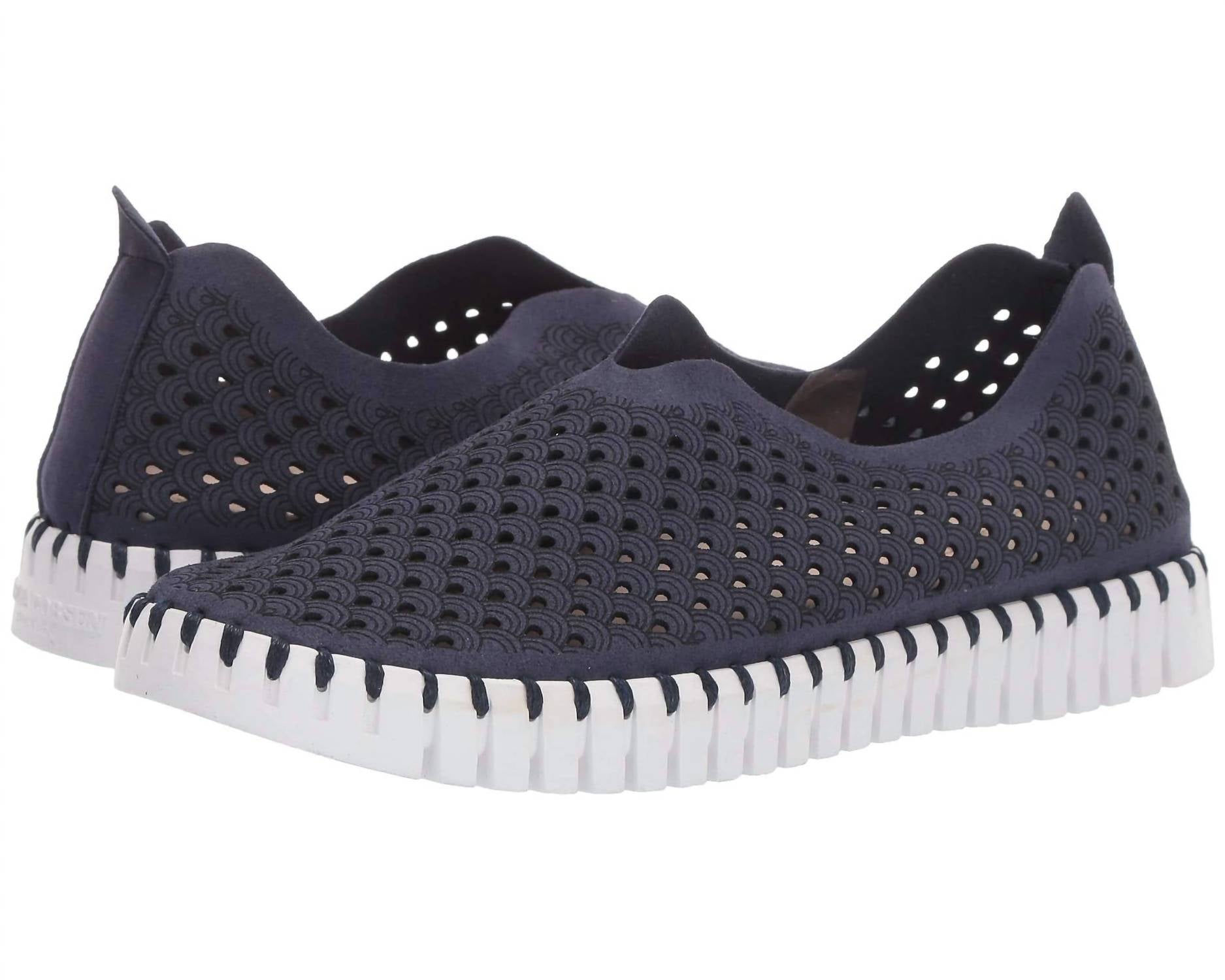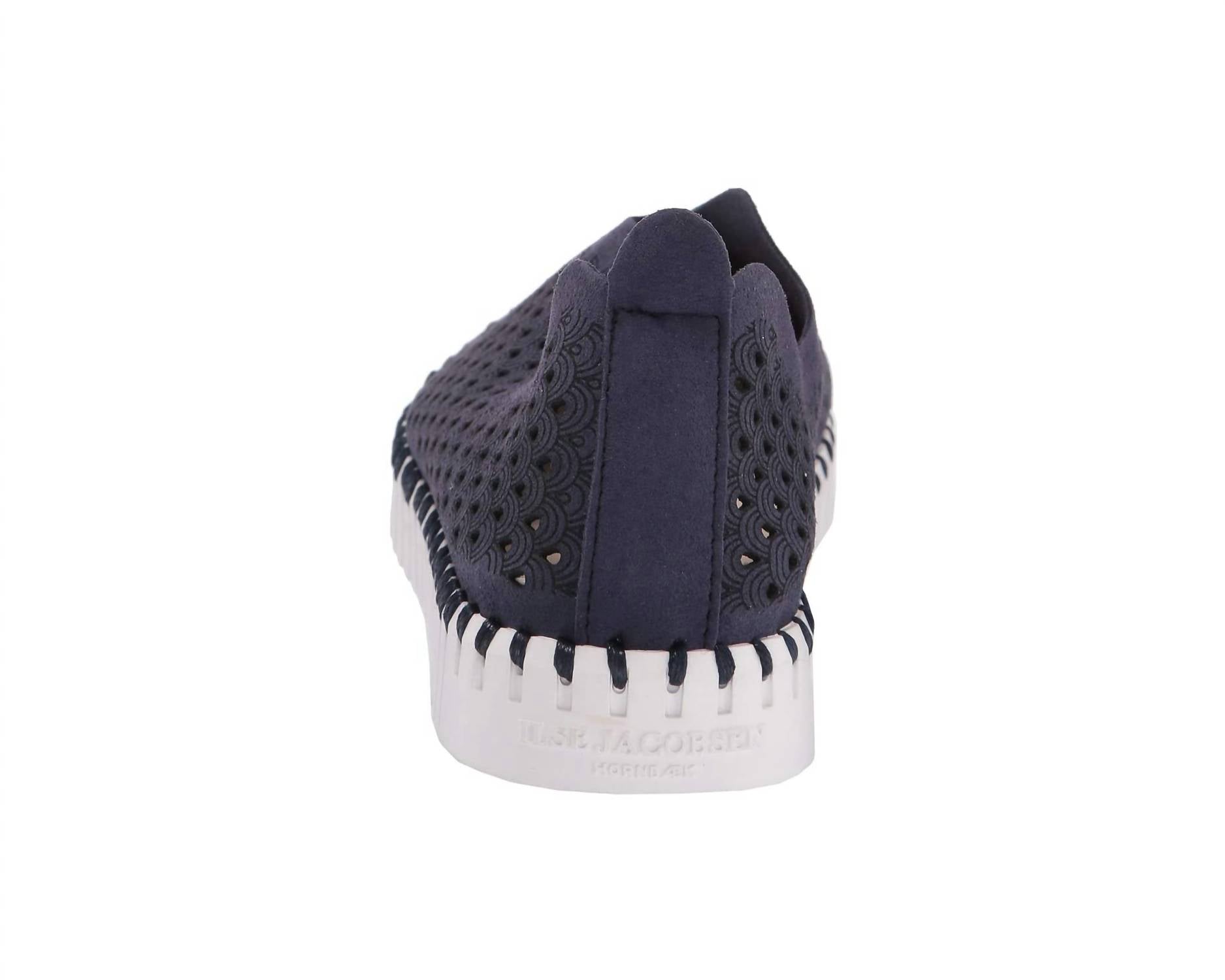 Loafers so versatile you can wear them with just about anything. Discover the Women's Tulip 139 Shoe by Ilse Jacobsen, a minimalist flat perfect for summer occasions. In a versatile navy shade, this casual loafer features a breathable upper with a laser-cut pattern, balanced on a flexible outsole crafted from natural rubber. Designed with a round toe shape and flat heel height under 1 inch, this shoe combines style and practicality. Ideal for travel, the upper construction uses recycled microfiber and is crafted without any glue, ensuring both comfort and fashion.