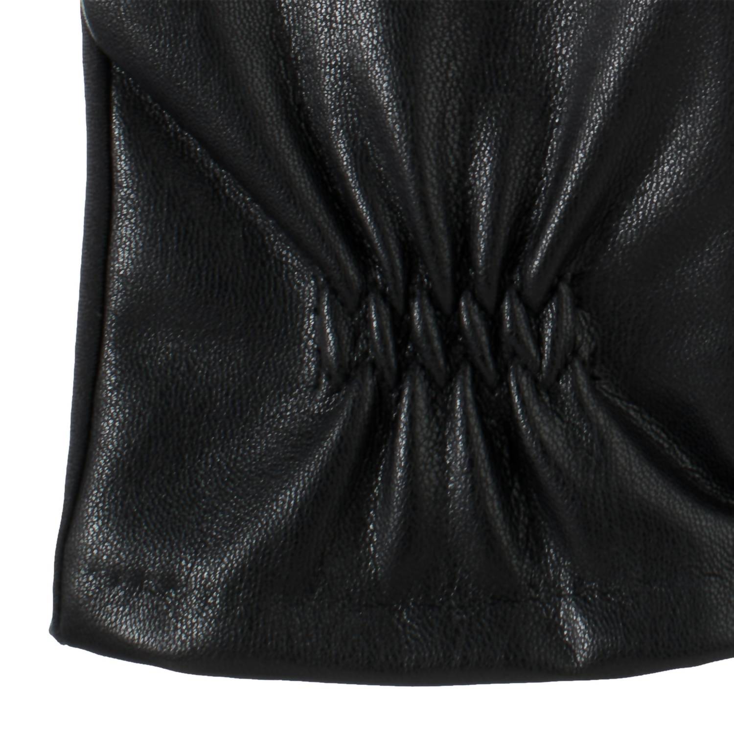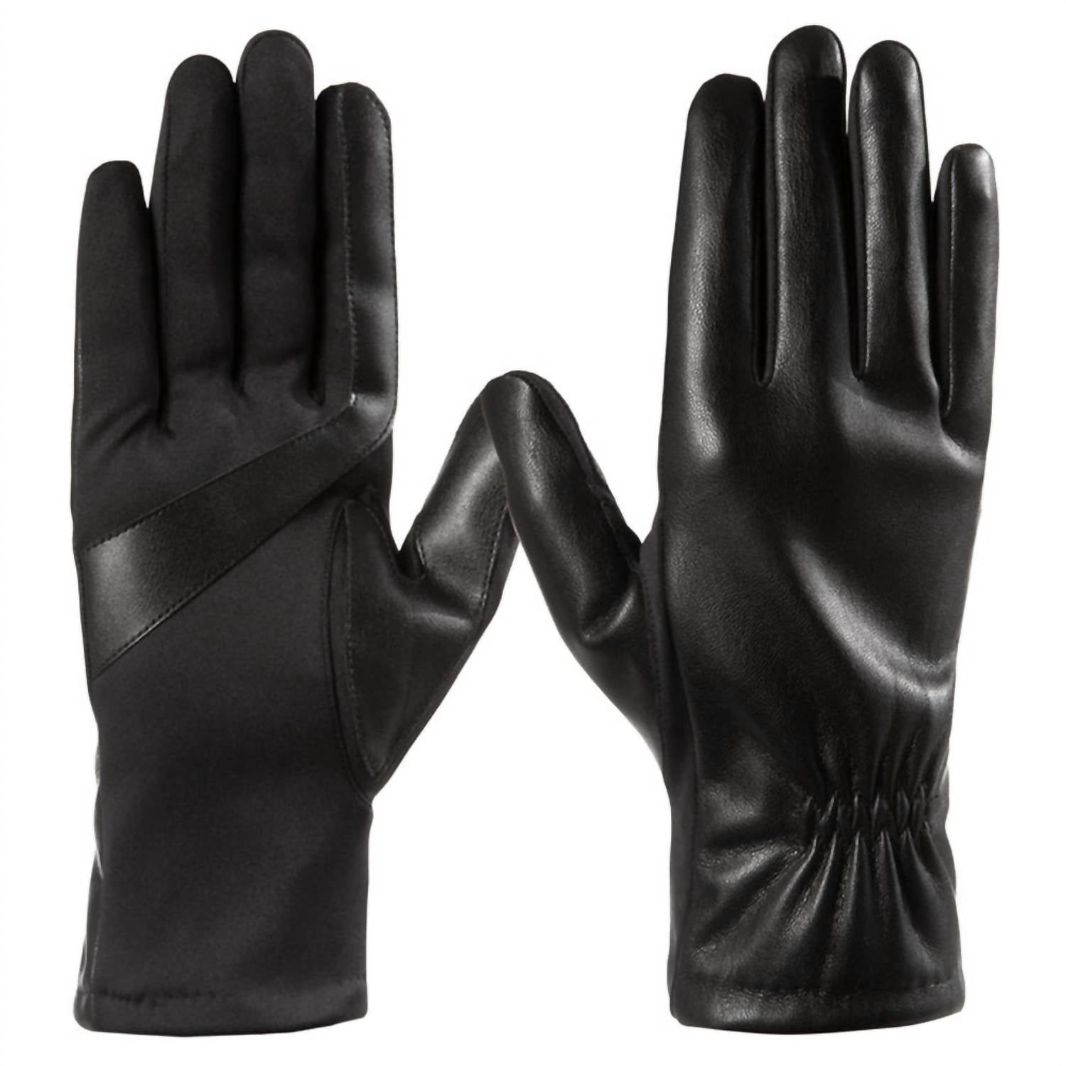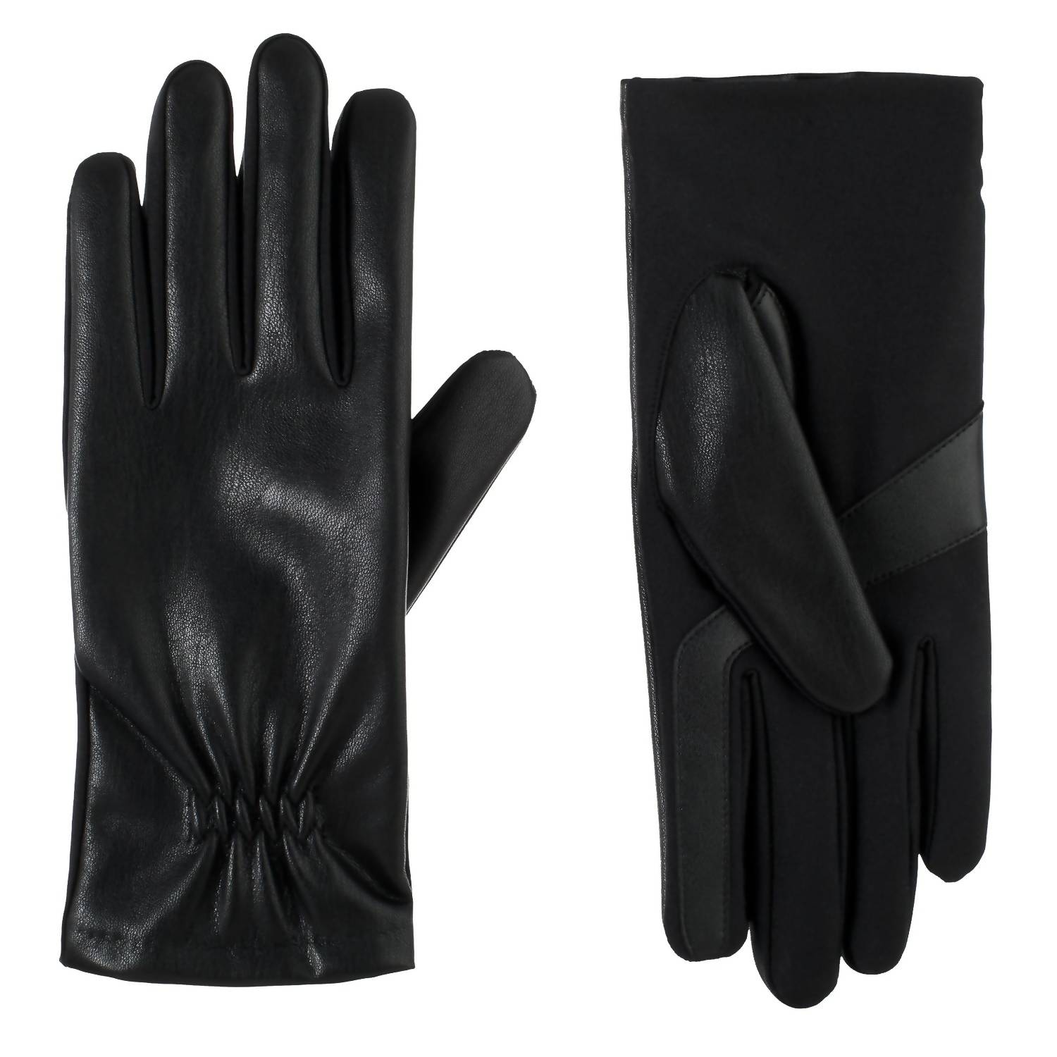 Embrace both style and functionality with the Women's Lined Faux Leather Stretch Gloves by Isotoner in classic black. Designed with seam detailing, these gloves combine faux leather with a spandex palm and palm patch for added grip. Benefit from SmarTouch® technology for superior touchscreen capability, and enjoy the comfort of a soft fleece lining. Care for your gloves by hand washing in cool water and drying flat; avoid bleach, tumble drying, ironing, or dry cleaning.