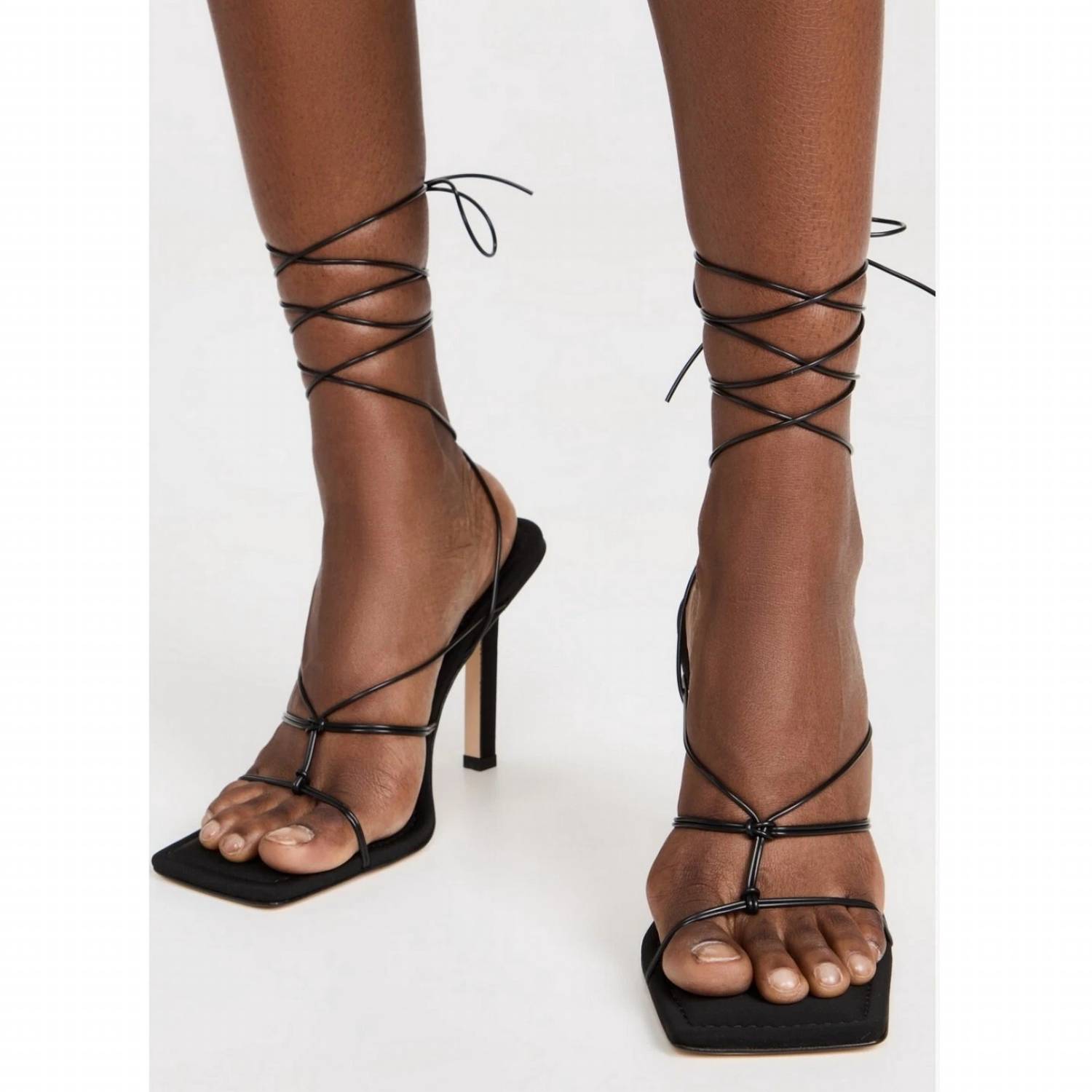 Step into sophistication with the GOOD AMERICAN Women's Caged Square Toe Strappy Neoprene Heels in sleek black. Designed with a distinct square toe and a secure tie closure, these heels feature a jelly cord upper and a neoprene insole that ensures comfort with every step. The striking stiletto heel stands at approximately 4 inches, capped in gold for an added touch of elegance. Perfect for your next evening event, these heels blend style and comfort seamlessly.