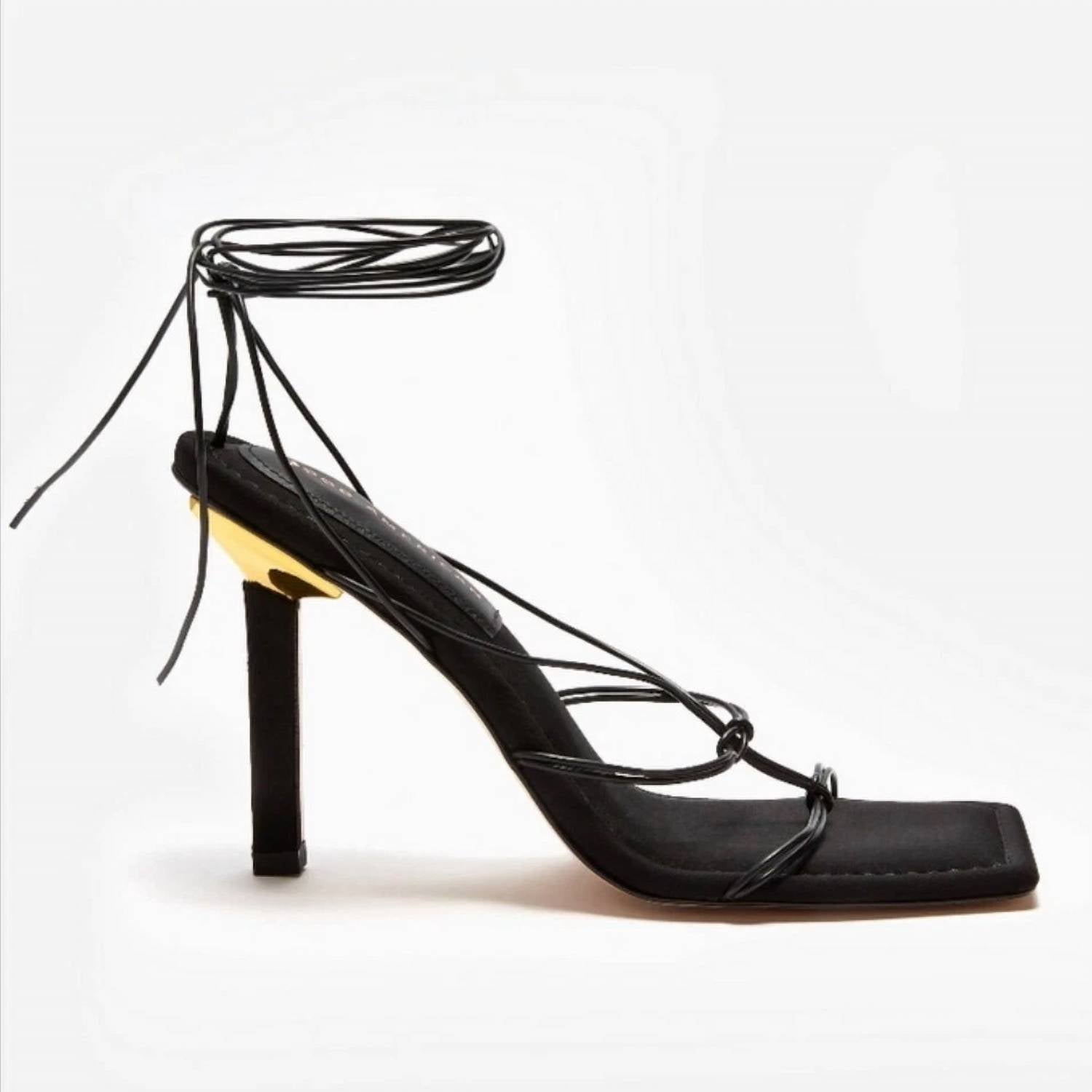 Don't be deceived, these heels are comfy as can be. Step into sophistication with the GOOD AMERICAN Women's Caged Square Toe Strappy Neoprene Heels in sleek black. Designed with a distinct square toe and a secure tie closure, these heels feature a jelly cord upper and a neoprene insole that ensures comfort with every step. The striking stiletto heel stands at approximately 4 inches, capped in gold for an added touch of elegance. Perfect for your next evening event, these heels blend style and comfort seamlessly.