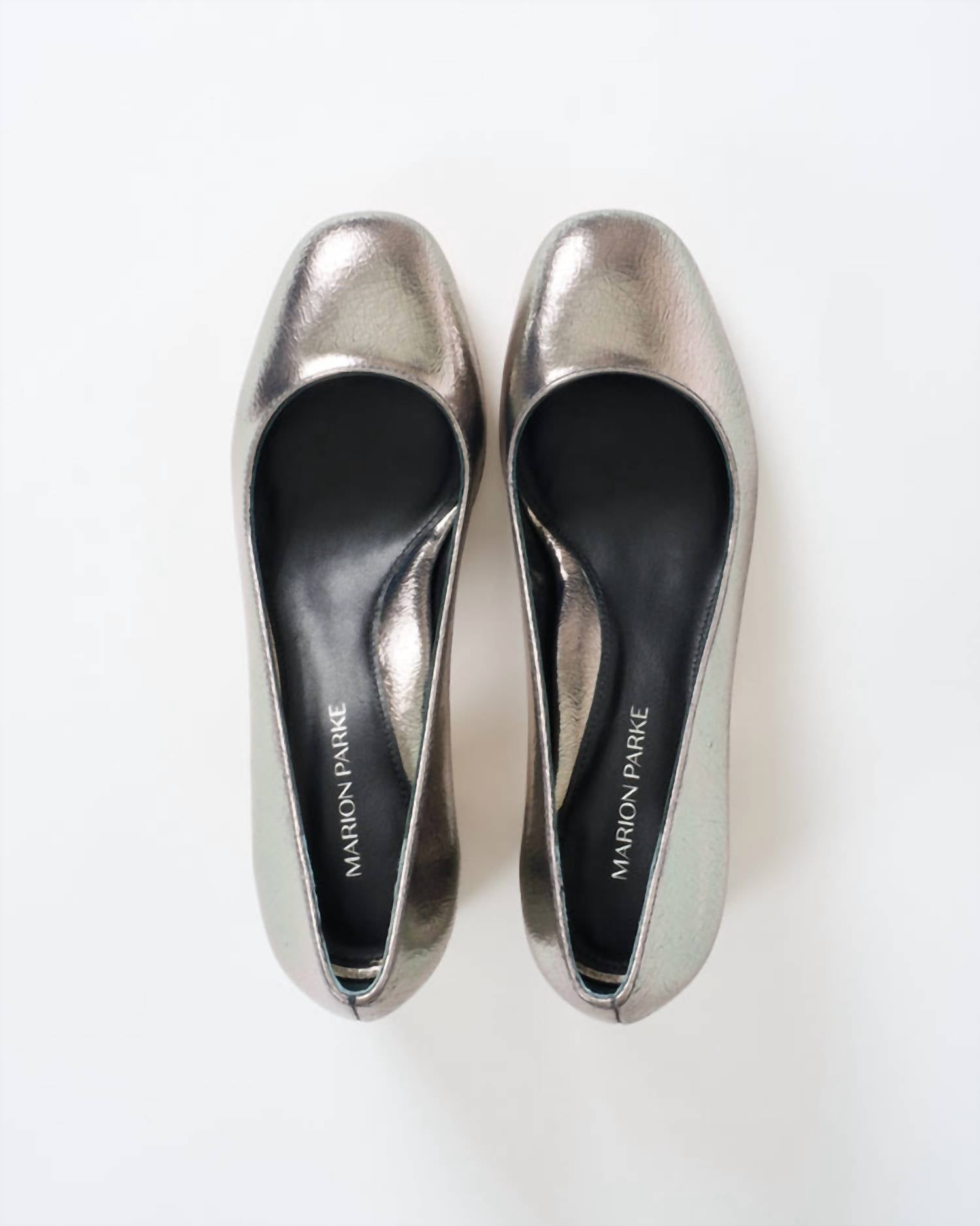 Don't be deceived, these heels are comfy as can be. These patent pumps are crafted from crinkle metallic leather, designed with a classic round toe and a chunky block heel for both style and stability. Each pair is unique, with natural variations in texture and markings that highlight the individuality of the leather.