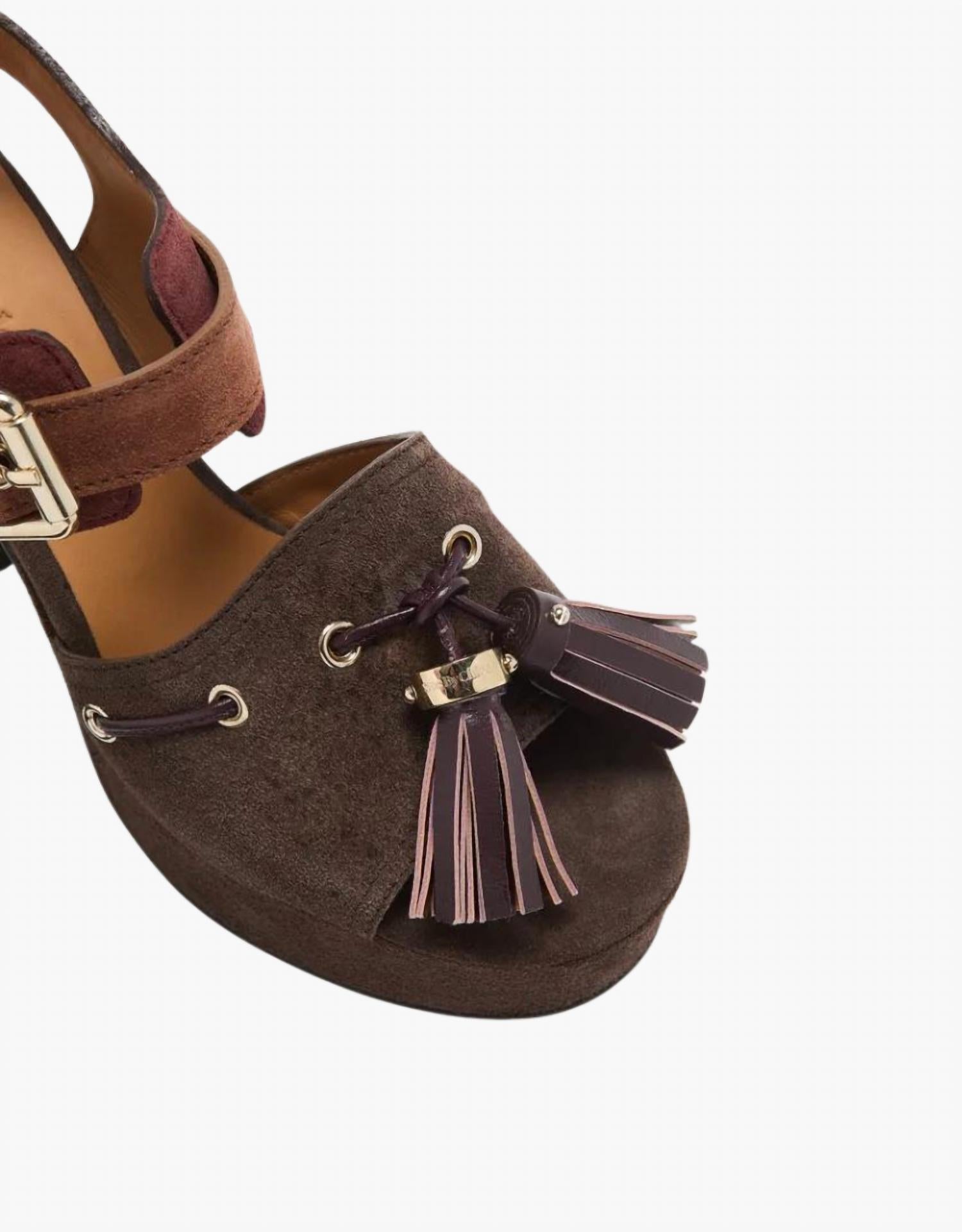 Pair these beauties with your favorite skinny jeans or dress for a night out on the town. Introducing the Women's Tassel Patchwork Platform Heels by See by Chloe, a chic update to your shoe collection in dark brown suede. These heels feature a captivating colorblock design, adorned with lacing and tassel accents for added flair. The open toe and buckle strap upper add a stylish touch, supported by a 4.33-inch block heel. With a rubber outsole and goat leather lining, these sandals promise both comfort and durability. Originating from Spain, they are designed for easy spot cleaning.