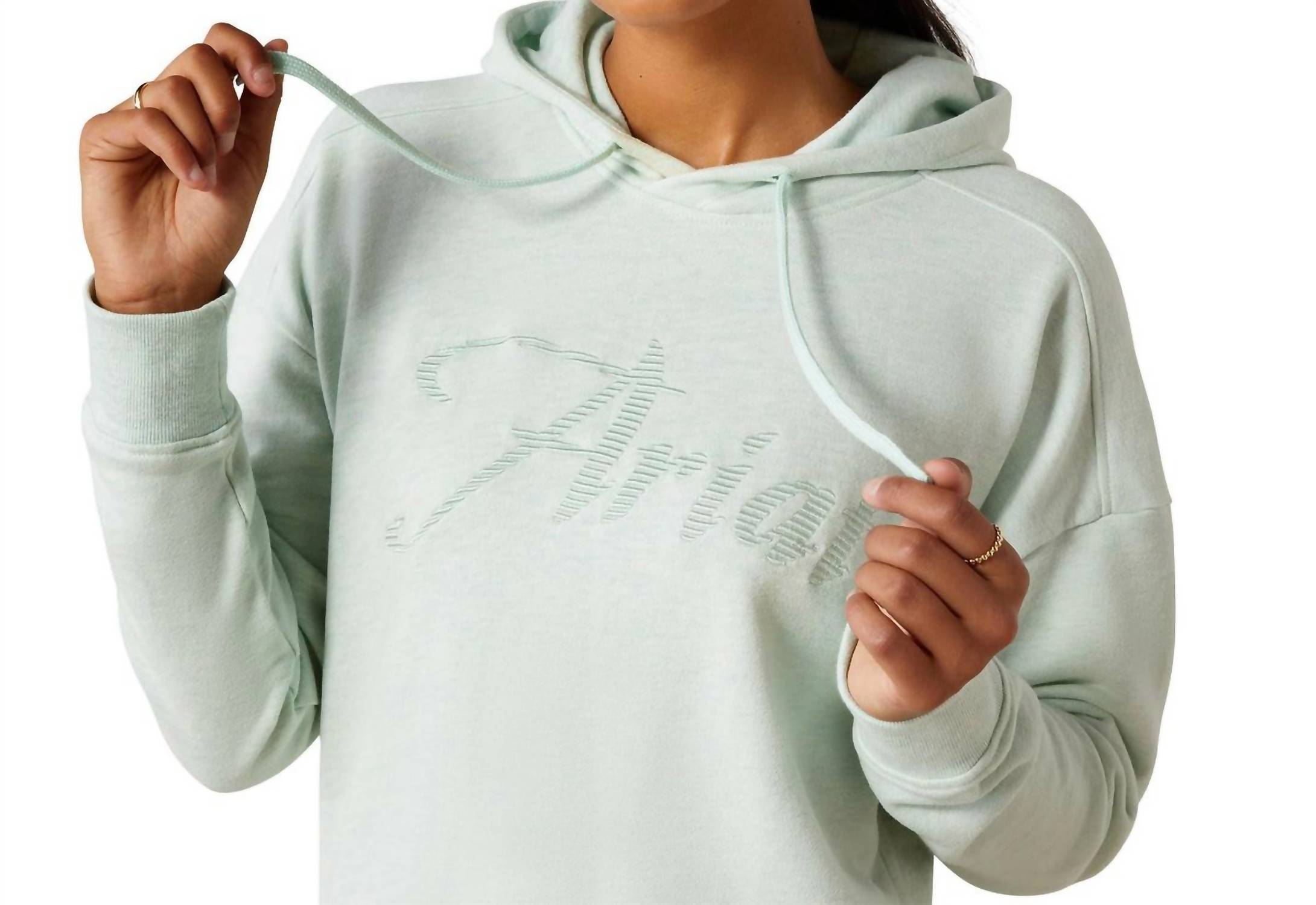 Introducing the Just Hoodie by ARIAT, a perfect blend of comfort and style. This women's long sleeve hoodie, crafted from an organic cotton and polyester blend, features a soft stretch terry material in a cropped style body. Adorned with a 3D screen print, it comes in a refreshing Beach Glass Heather color. With a pull-on closure for easy wear, this imported hoodie is ideal for a casual holiday party ensemble.