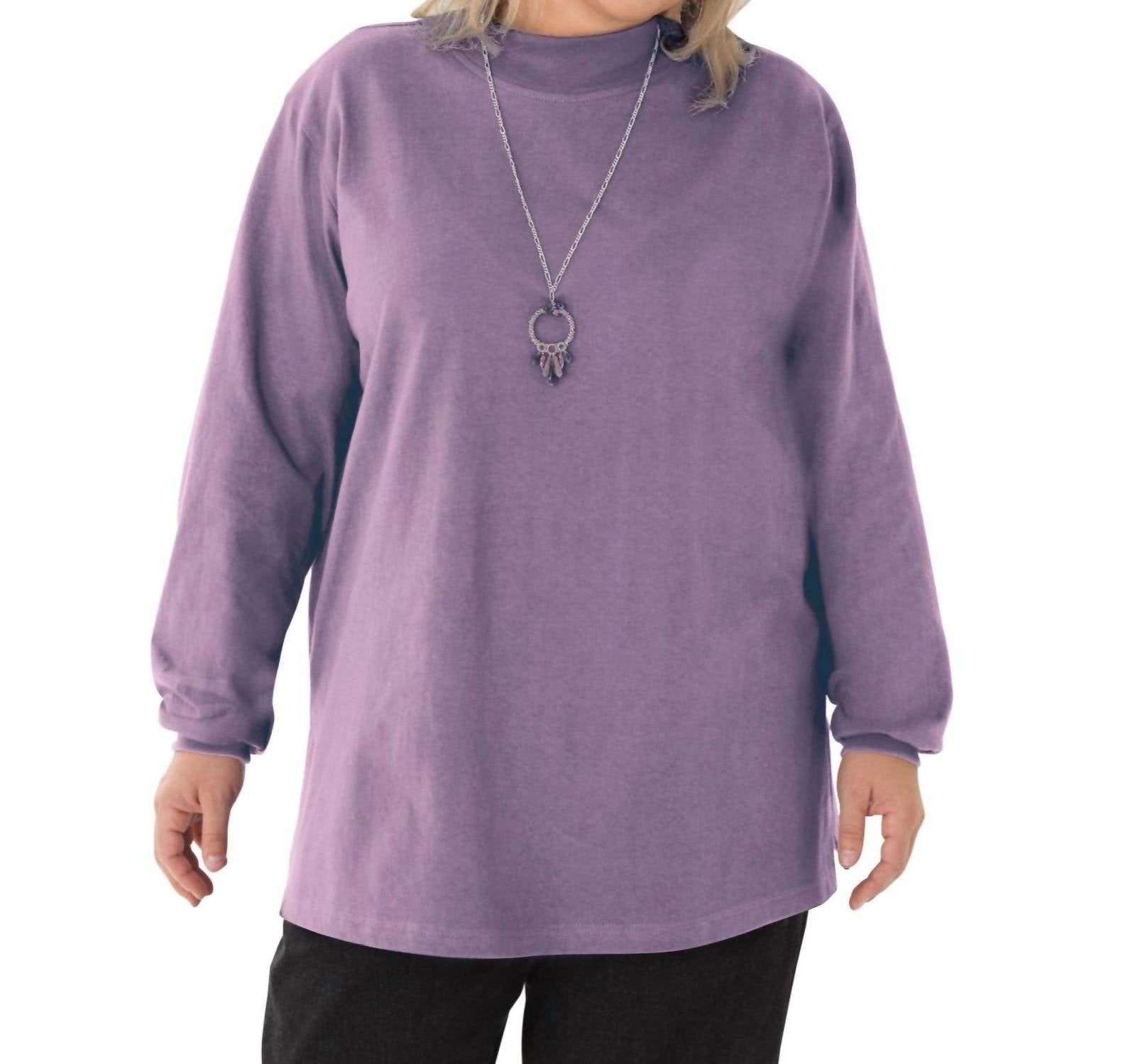 Cozy fabric, impeccable design - Meet the sweatshirt that you'll never want to take off. The On The Plus Side Dusty Lavender Mock Turtleneck Long Sleeve Top is a must-have addition to your fall wardrobe. Made from a soft cotton blend with 95% cotton and 5% spandex, this top offers comfort and a flattering fit. The design features long sleeves and a pull-on closure with chic side slits and a center back seam for added style. At 34" long with 23" sleeve length in size 4X, it is perfect for your travel and Thanksgiving occasions. Care instructions include machine wash cold with similar colors.