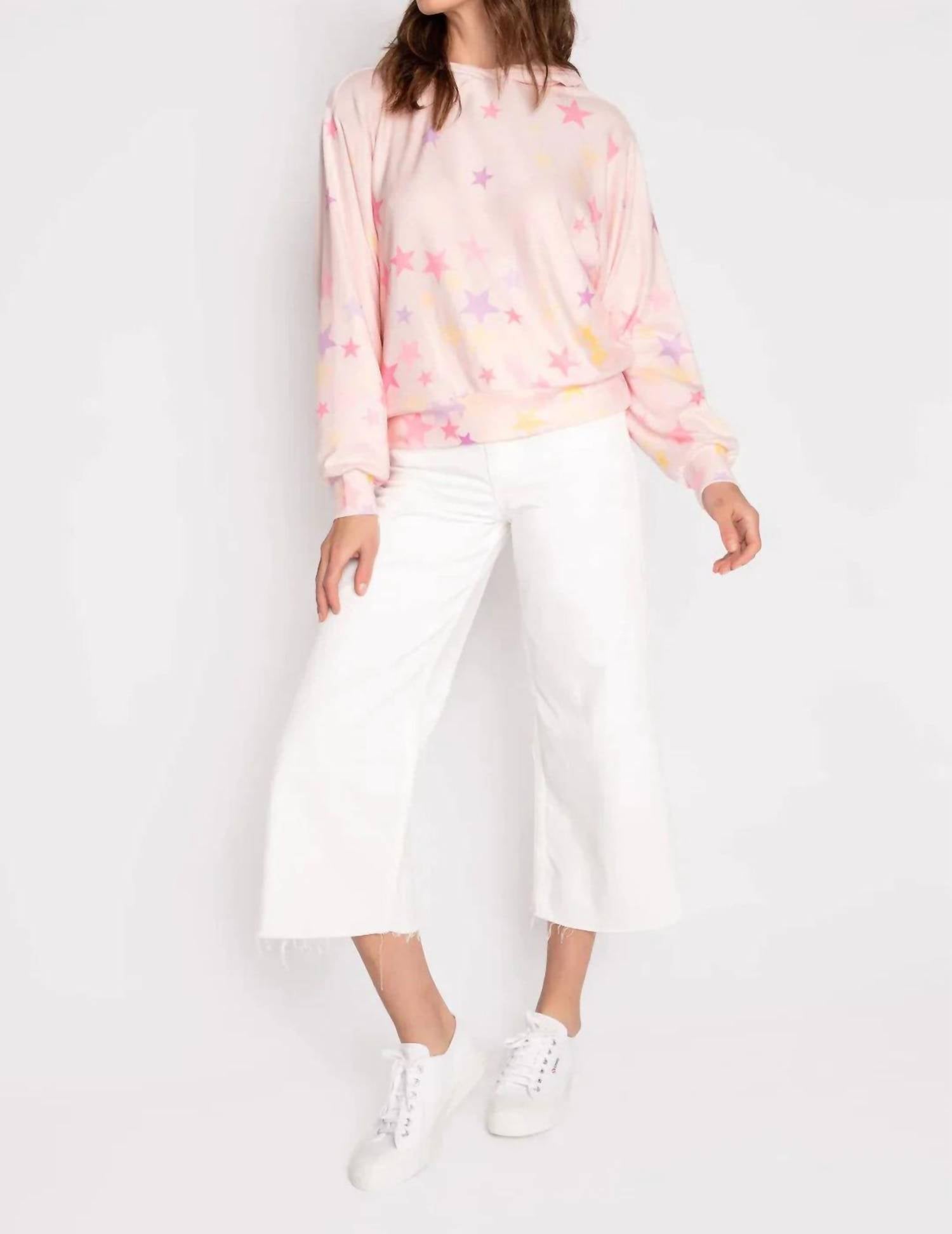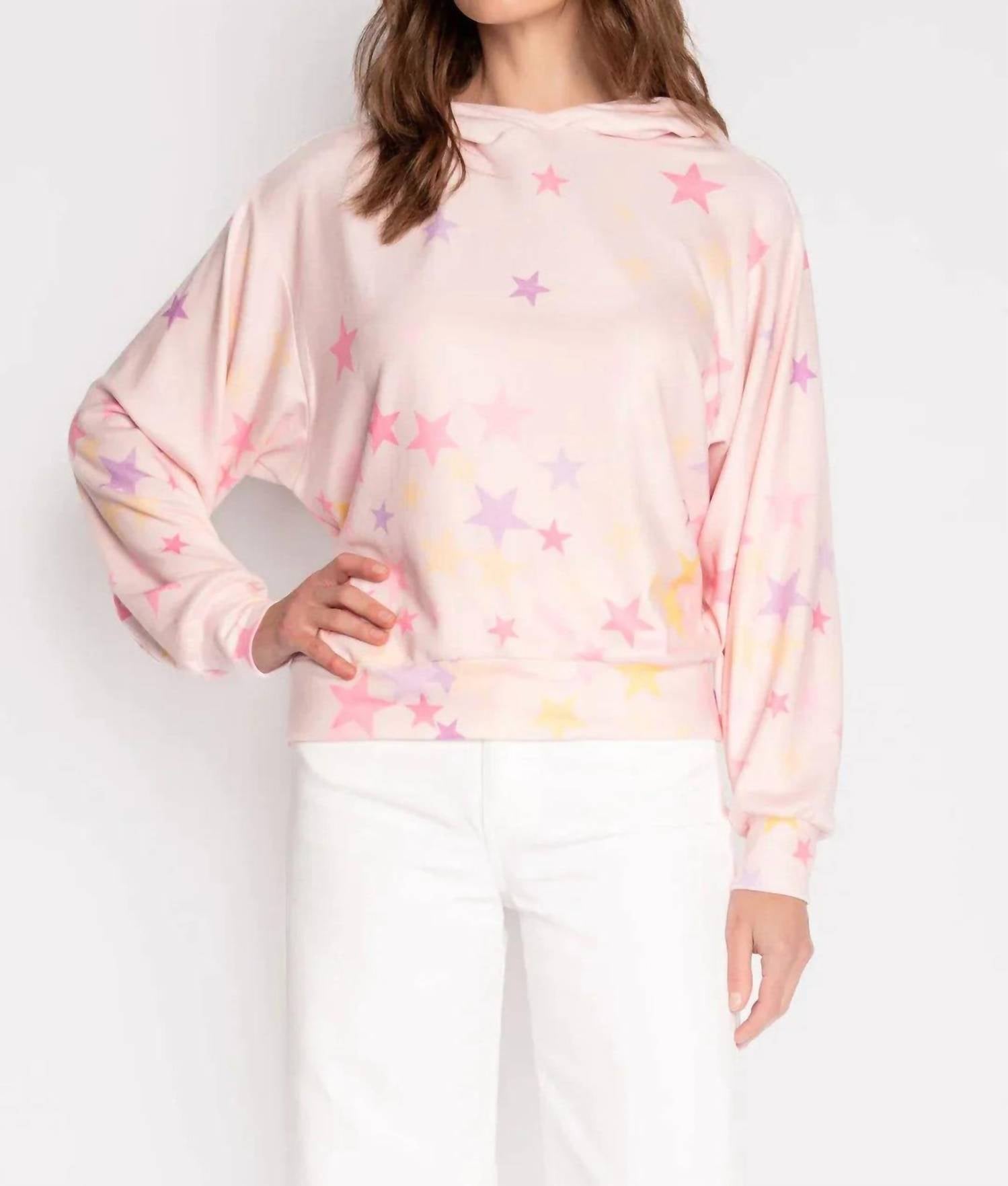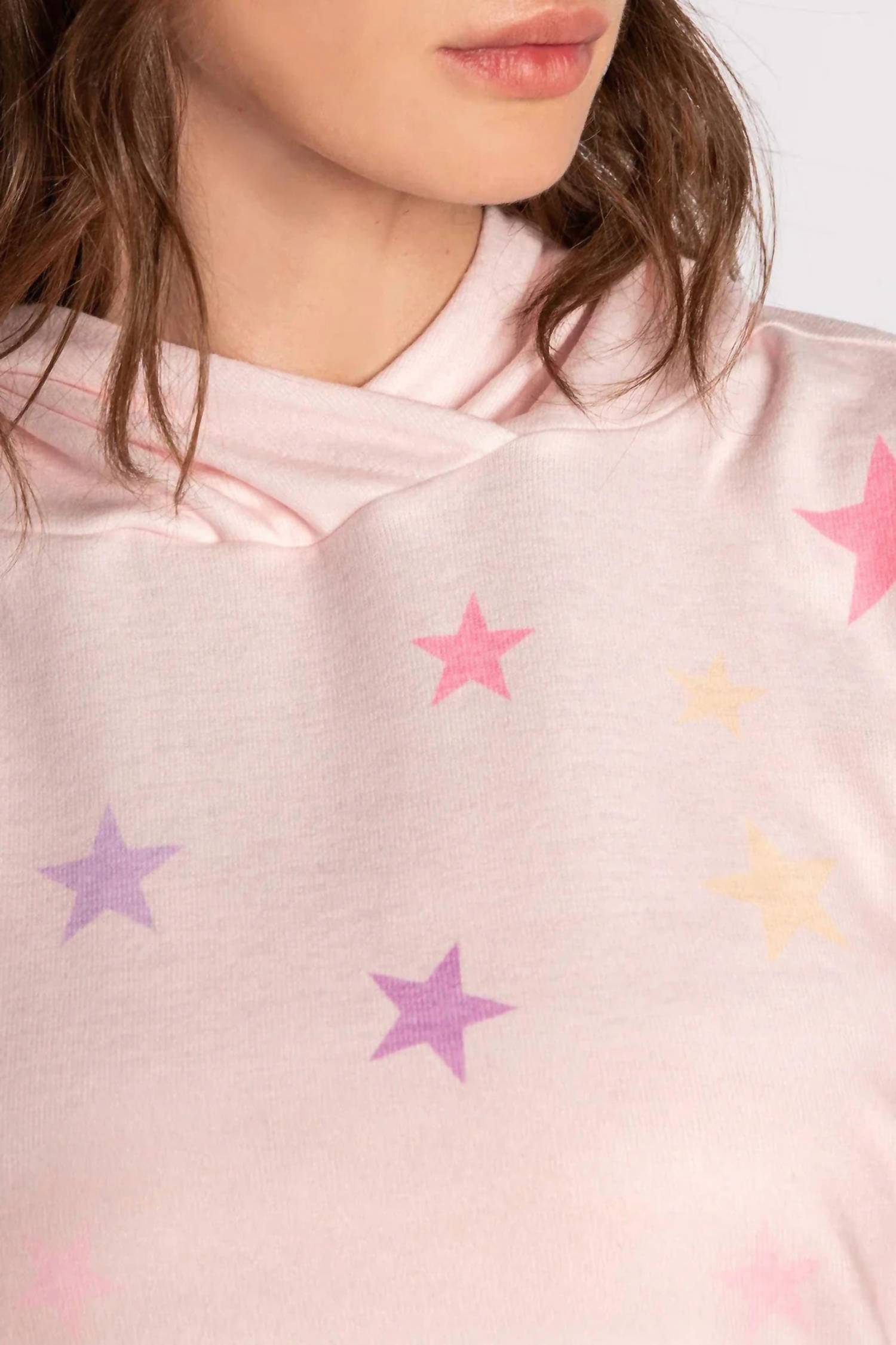 Stay cozy and stylish with the PJ Salvage Peachy Party Star Hoodie in delightful blush. This long-sleeve pullover, decorated with a playful star print, provides an effortlessly chic look perfect for both music festivals and lounging at home. Crafted from 81% Polyester, 14% Rayon, and 5% Elastane, it features an attached hood design without pockets for a sleek silhouette. This imported piece ensures comfort and style, with easy-care instructions of machine wash and tumble dry.