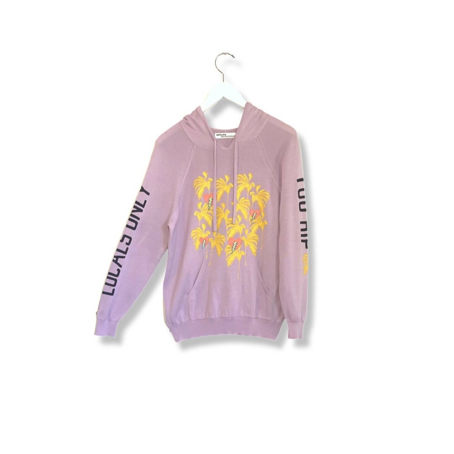 Whether you're running around town or lounging at home, this sweatshirt works for both. Introducing the Palm Hearts Hoodie by Replica Los Angeles, a stylish purple addition to your streetwear collection. This hooded sweatshirt features long sleeves with intarsia wording and an embroidered heart design over a palm tree screenprint, all made from a cozy cotton and modal blend. The relaxed fit with pocket detail offers a comfortable, everyday wear perfect for travel and more. Closure: Pull on. Care: Dry clean or hand wash cold.