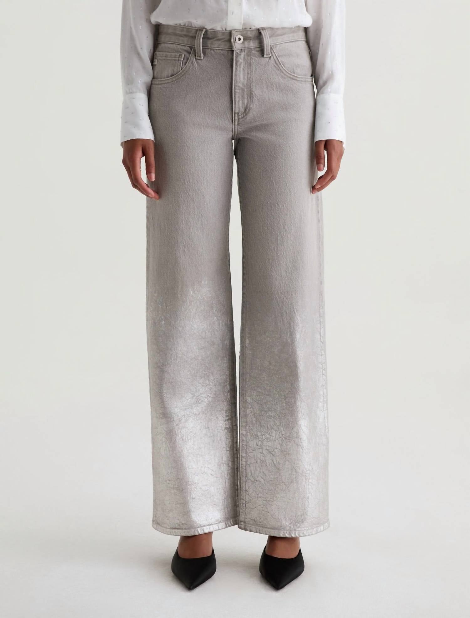 Introducing the Adria Low Rise Wide Leg Jeans by AG Jeans, designed in a striking Silver Myst shade with a shimmery ombré foiled detail. These jeans feature a low-rise waist that elegantly hangs on the hip and a wide leg that gracefully puddles at the hem. Crafted from a cotton blend with Flex 360° Denim for all-direction stretch, they offer boundless comfort and a flattering fit. Closure: Button closure. Measurements for a size 27 are 13 inches in waist and 39 inches in length. Care: Machine wash cold. Model Lauren wears a size 27, typically a size 28, highlighting the need to size down for a perfect fit.