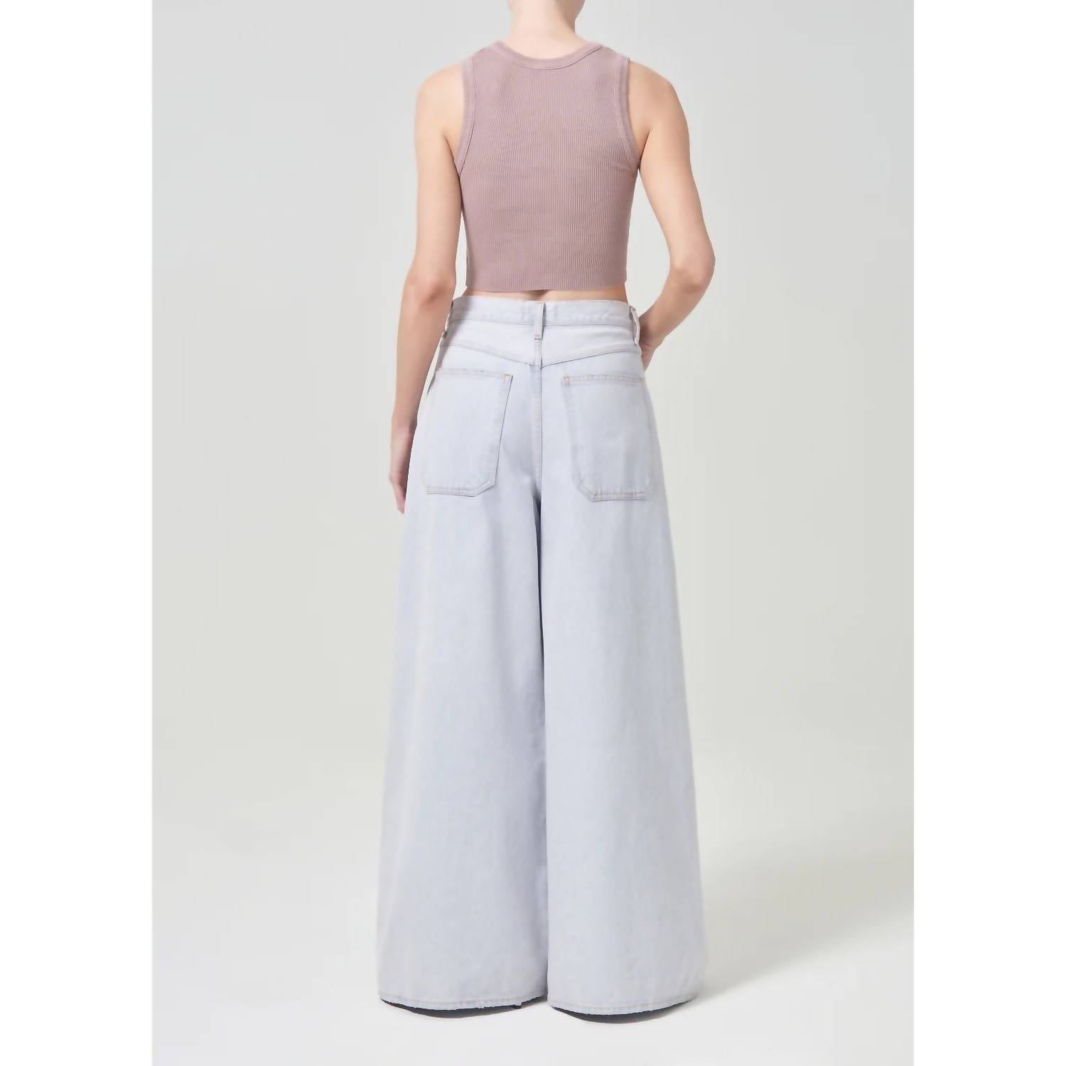 The Nolan Jean by AGOLDE is a statement piece in women's fashion, featuring a high-rise waist and a wide leg style with a gaucho silhouette, perfect for a holiday party. Crafted from zero stretch regenerative cotton, these jeans offer an ultra-soft feel in a solid balloon color with a light wash denim finish. The classic fit design includes utility-inspired pockets and a zip closure for practicality and style.