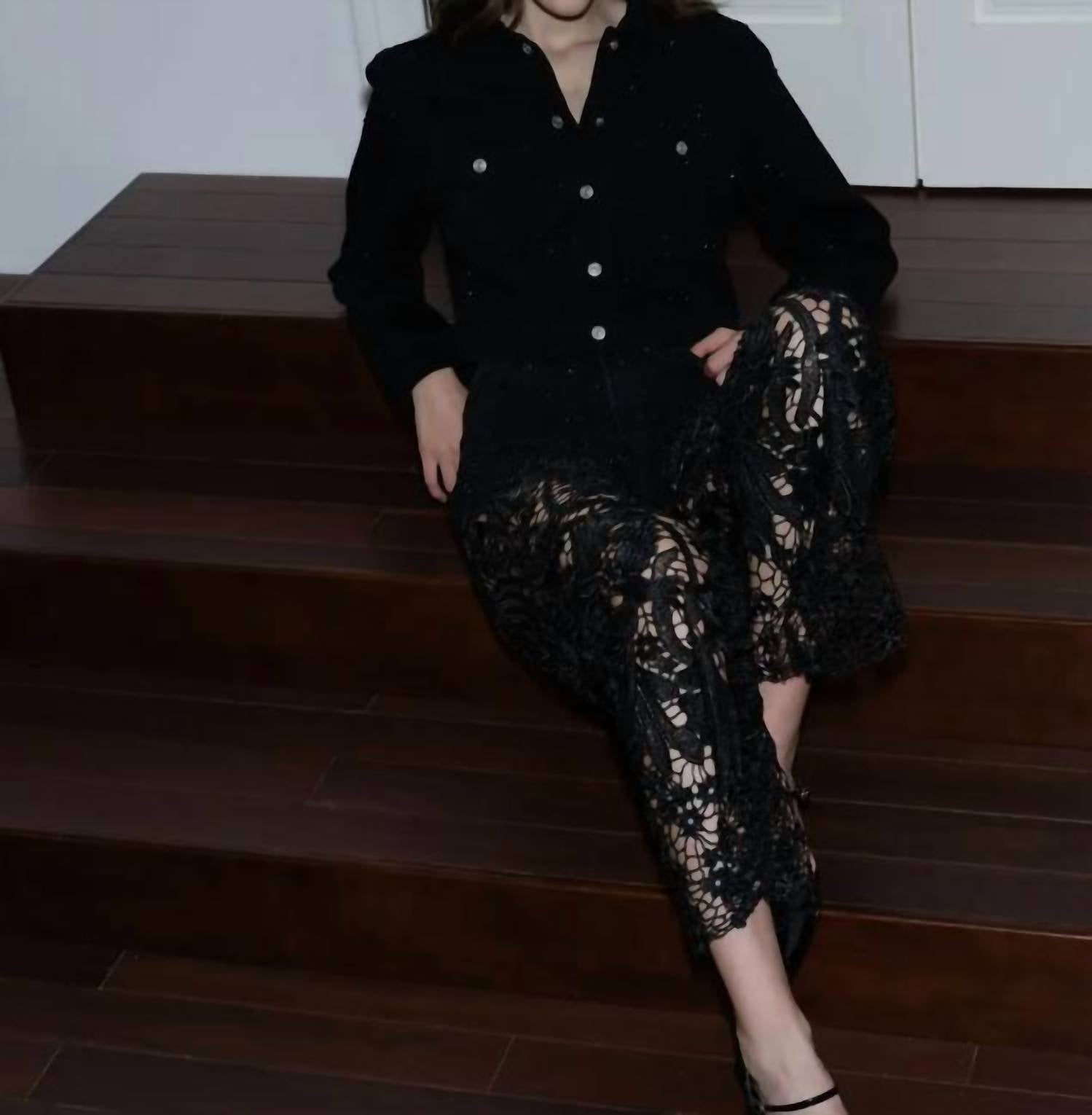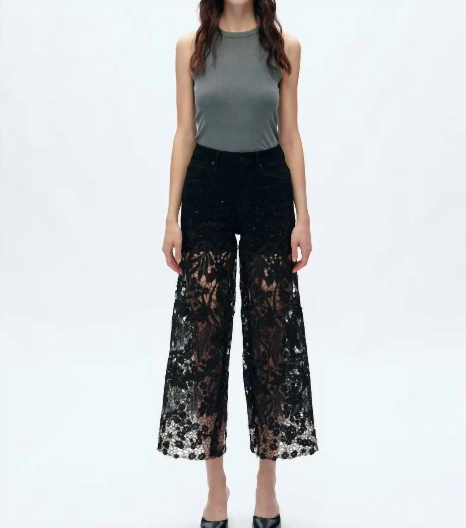 Boost your wardrobe with the High Waist Crystal Embellished Lace Wide Leg Jeans by Bayeas, offering a unique fusion of style and comfort. Crafted in a textured cotton blend, these black jeans feature a flattering high rise with a 31.5" inseam and a relaxed fit. Stylish details include crystal embellishments and sheer guipure lace panels, complemented by a convenient button and zip fly closure alongside a five-pocket design. Care instructions: machine wash and line dry to maintain their chic look season after season.