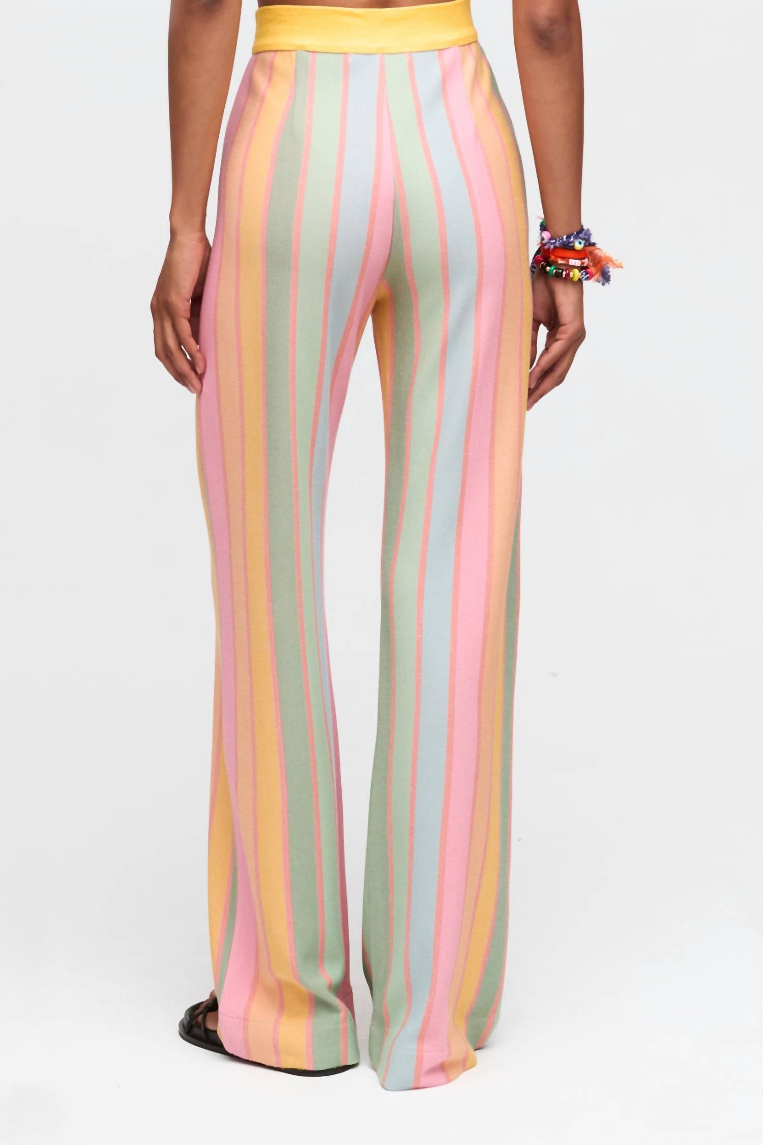 Introducing the Martin Pant by Aldo Martins, a vibrant multicolor addition to your wardrobe perfect for summer fashion. These straight-cut wide-leg trousers feature an elastic waistband with a pull-on closure for easy wear and a regular fit. Crafted from a blend of bamboo, cotton, rayon, viscose, and polyamide, these striped trousers offer a high-rise design ideal for music festivals and Easter celebrations. Care instructions: Hand wash only.