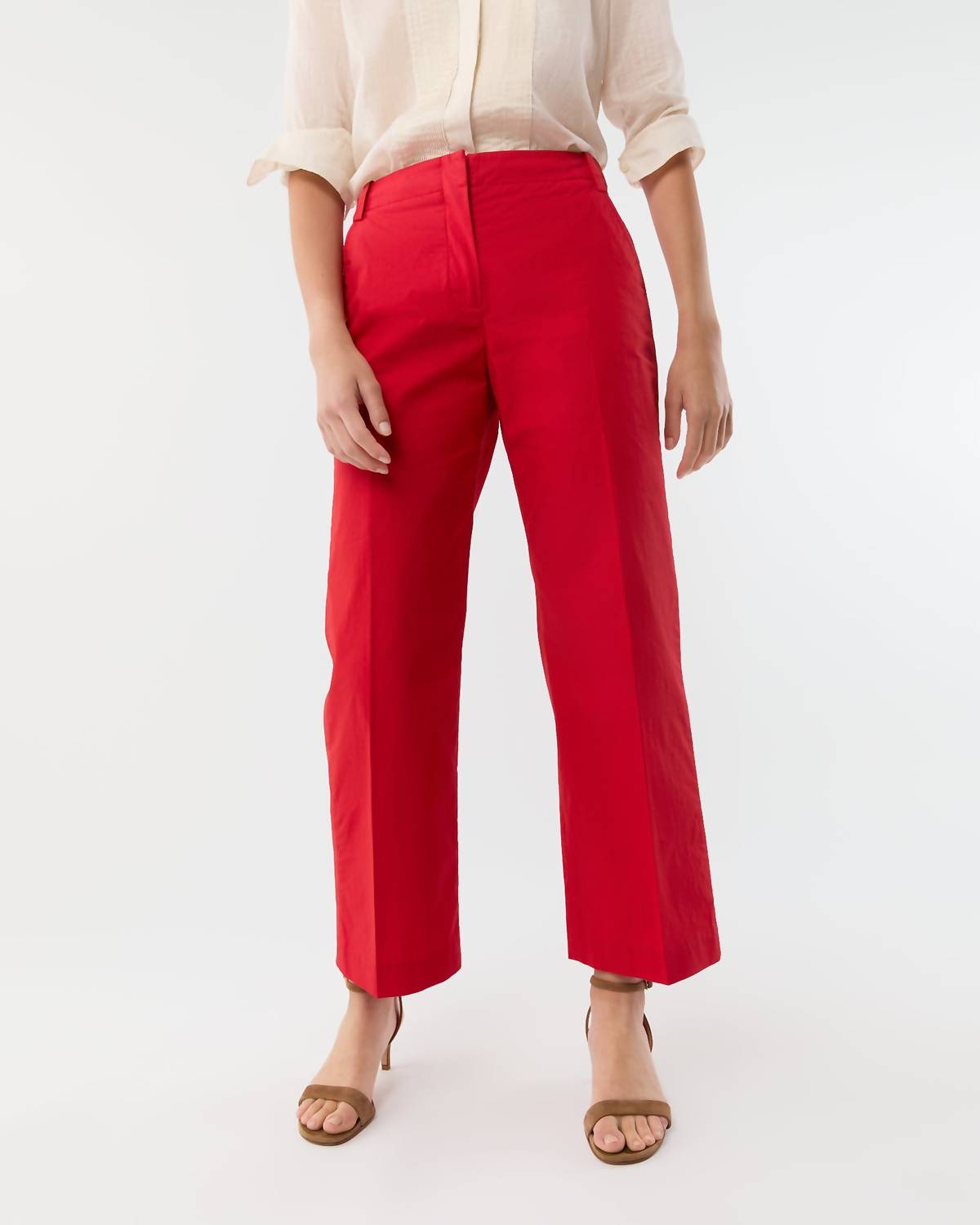The Frankie Cropped Pant by Ann Mashburn in vibrant red is an essential addition to your wardrobe, perfect for both travel and workwear. Featuring a mid-rise and a straight leg style, these pants are crafted from Italian stretch twill composed of 98% cotton and 2% elastane, ensuring comfort and flexibility with a 28-inch inseam and a 20-inch leg opening. They come equipped with practical front slant pockets, back welt pockets, and a discreet hook-and-eye closure along with a zip fly for a seamless look. Made in China, these pants are easy to care for—simply machine wash and tumble dry low, with a cool iron if needed, and avoid bleaching.