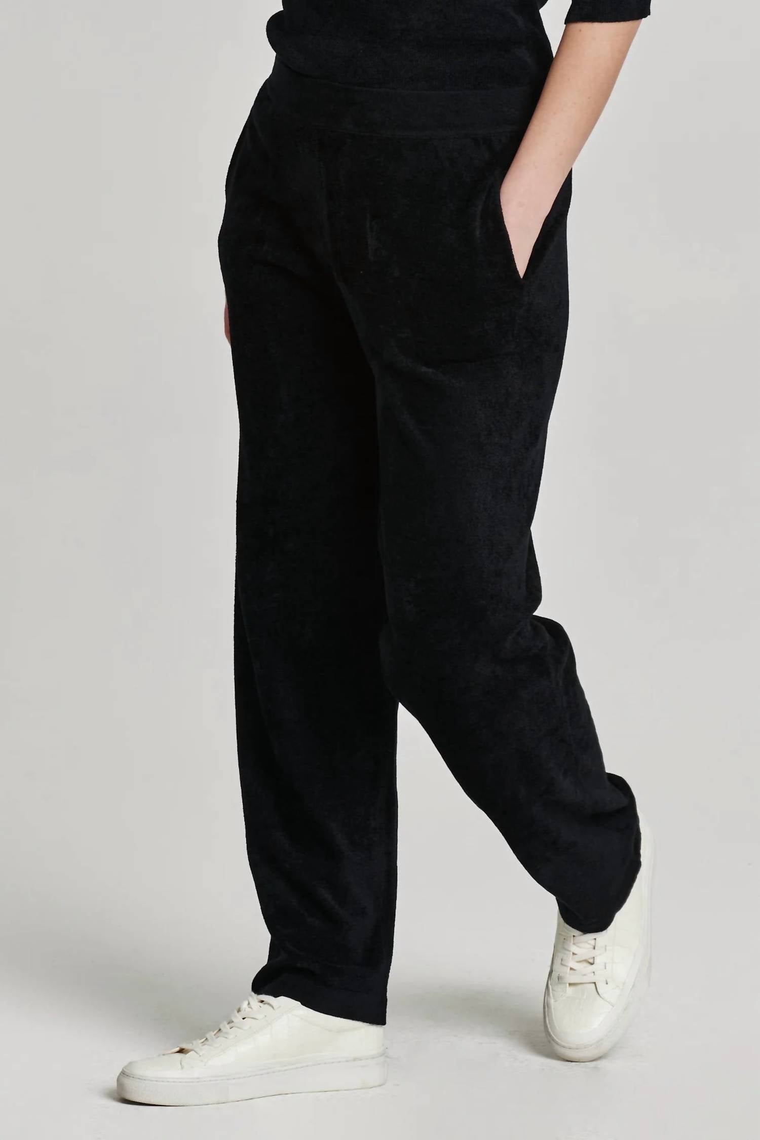 A straightleg pant that workes season after season. Dress these up with your favorite blouse or keep it casual with your go-to tee. Experience the plush luxury of the Carson Tapered Leg Pants by Another Love, crafted in a sumptuous black chenille rib. These pants offer a regular fit with a high rise and feature a convenient pull-on closure, complete with slant pockets for practicality. Made with a viscose blend, they highlight a tapered leg design and a generous front rise of 13 inches with a 30-inch inseam. Care is a breeze with machine wash cold followed by reshaping to dry flat, and they're expertly crafted for versatility, perfect for your spring and travel occasions. 67% VISCOSE 33% VISCOSE.