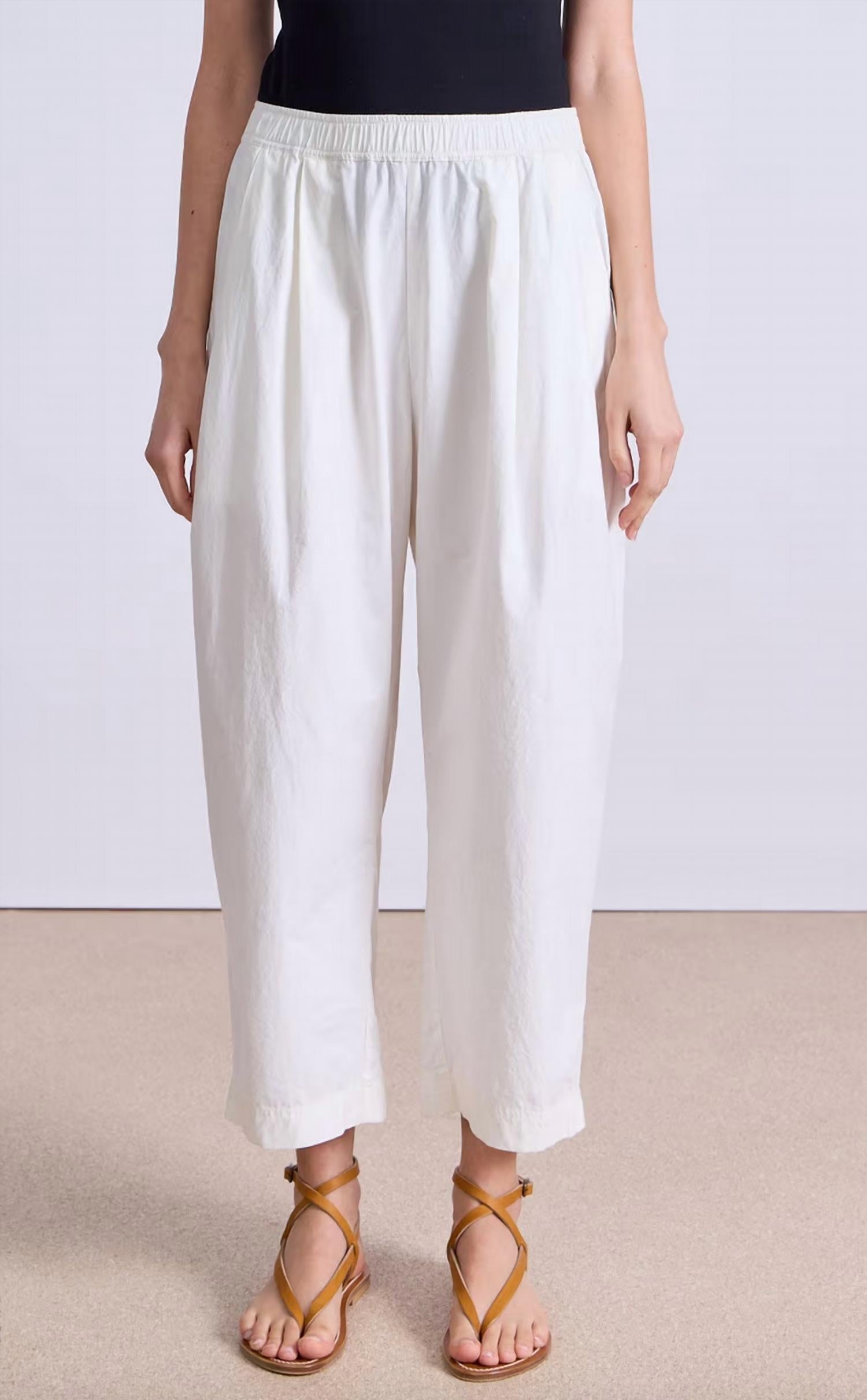 Embrace minimalist elegance with the Spa Pleat Pant by APIECE APART in a classic cream hue. Expertly crafted from 100% organic cotton, these pants feature a relaxed fit and high-rise waist, complete with an elastic waistband and front pleats for added comfort. With a barrel-shaped leg, inseam of 25", and convenient front slant and back patch pockets, they're perfect for pairing with simple tanks or lightweight blouses. Made in India, these pants boast a pull-on closure and are easy to care for: simply machine wash on a gentle cycle with like colors and lay flat to dry.