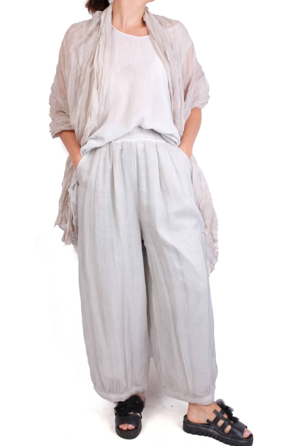 Elevate your vacation wardrobe with the Elastic Waist Harem Pant by Baci, tailored for women seeking relaxed elegance. These Ice-colored wide-leg pants, crafted from a luxurious viscose blend with a sheer overlay, feature a practical pull-on closure and convenient pockets. The pants offer a comfortable relaxed fit, perfect for summer occasions when paired with a tucked hem design. Overlay composition is 70% Viscose and 30% Nylon, with a soft 100% Cotton lining for added comfort, embodying the trend of Quiet Luxury for your Thanksgiving plans.
