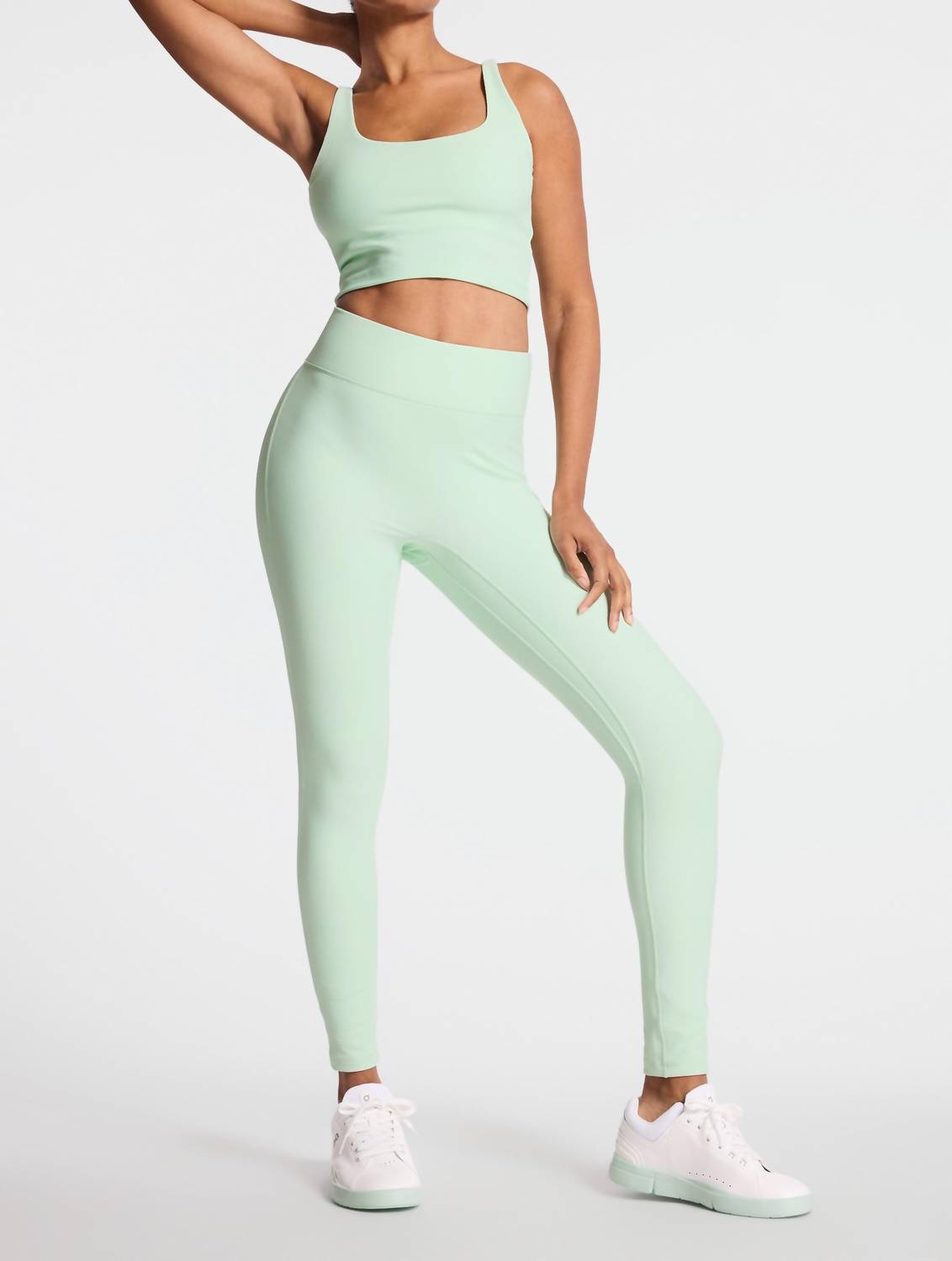 Leggings you can dress up or down for any occasion. Step into the spotlight with the Center Stage Rib Leggings by BANDIER, perfect for fitness or casual outings in trendy athleisure style. These women's leggings feature a high-rise waist with a wide double-layer elastic waistband and a skinny leg style, ensuring a comfortable and flattering slim fit. Crafted from a lightweight 76% Nylon and 24% Spandex blend, they offer all-way stretch for unrestricted movement. With a 26 1/4" inseam, adjusted gusset lining, and pull-on closure, these dusty aqua leggings are both practical and fashionable. Care: Machine wash.