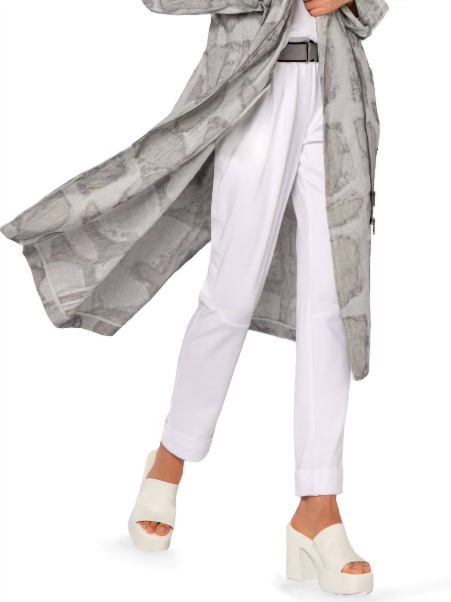 Pair these with your favorite sneakers for an effortlessly cool look. The BLAIR casual pant/jogger in white is a tried and true well-fitting pull on with front pleat, from Beate Heymann. We love the forward seaming and ribbon details for a slim line. Make this part of your everyday uniform to look polished and casual at the same time! Belt included