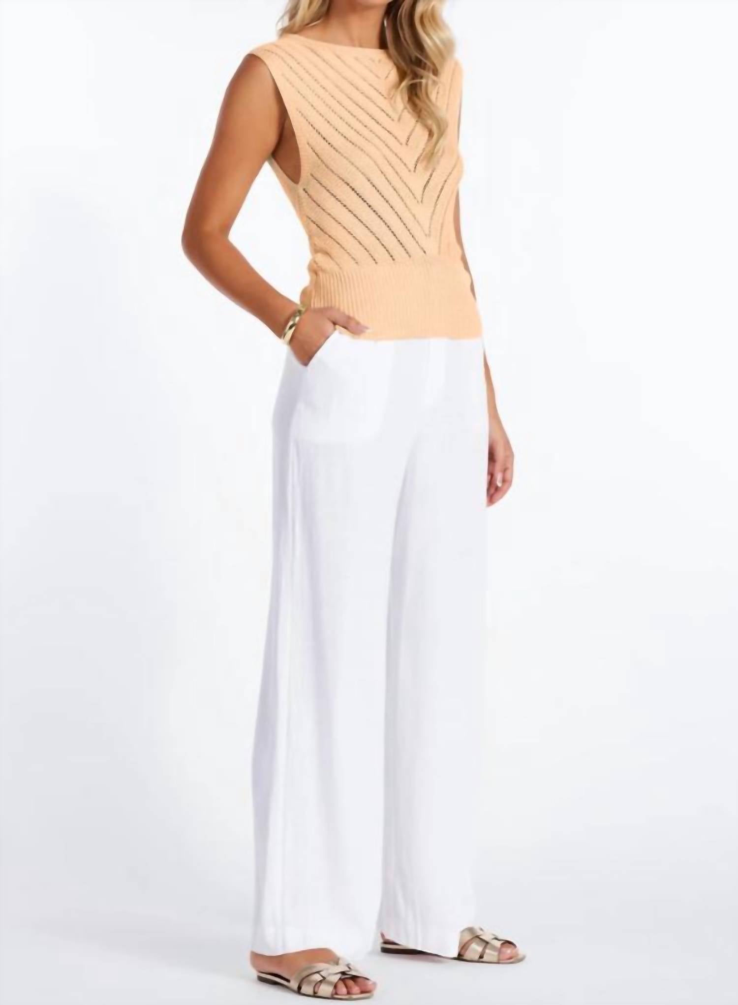 Experience the perfect blend of polished and relaxed style with the Sorrento Linen Pant by Bishop + Young. Designed in a serene Shell color, these wide-leg pants feature a high-waisted silhouette, side pockets, and front pleat detailing. Composition: 30% Linen, 70% Viscose. Closure: Zipper closure. Care: Machine wash, tumble dry. Ideal for summer, these solid pants embody the maximalist trend, perfect for vacation settings.