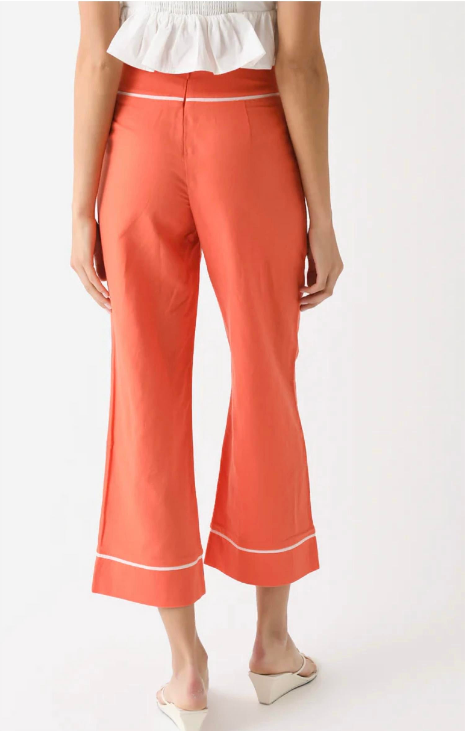 A bright wide-leg pant made from lightweight cotton with contrast piping details. High Rise Button Waist Tabs Side Pockets Contrast Piping Wide Leg Silhouette Cotton Linen Blend Classic Fit Model is wearing size 2 pant. Model's Measurements: Height: 5'10.5" | Bust: 32B | Waist: 25" | Hips: 36" | Dress Size: 0-2 (US)