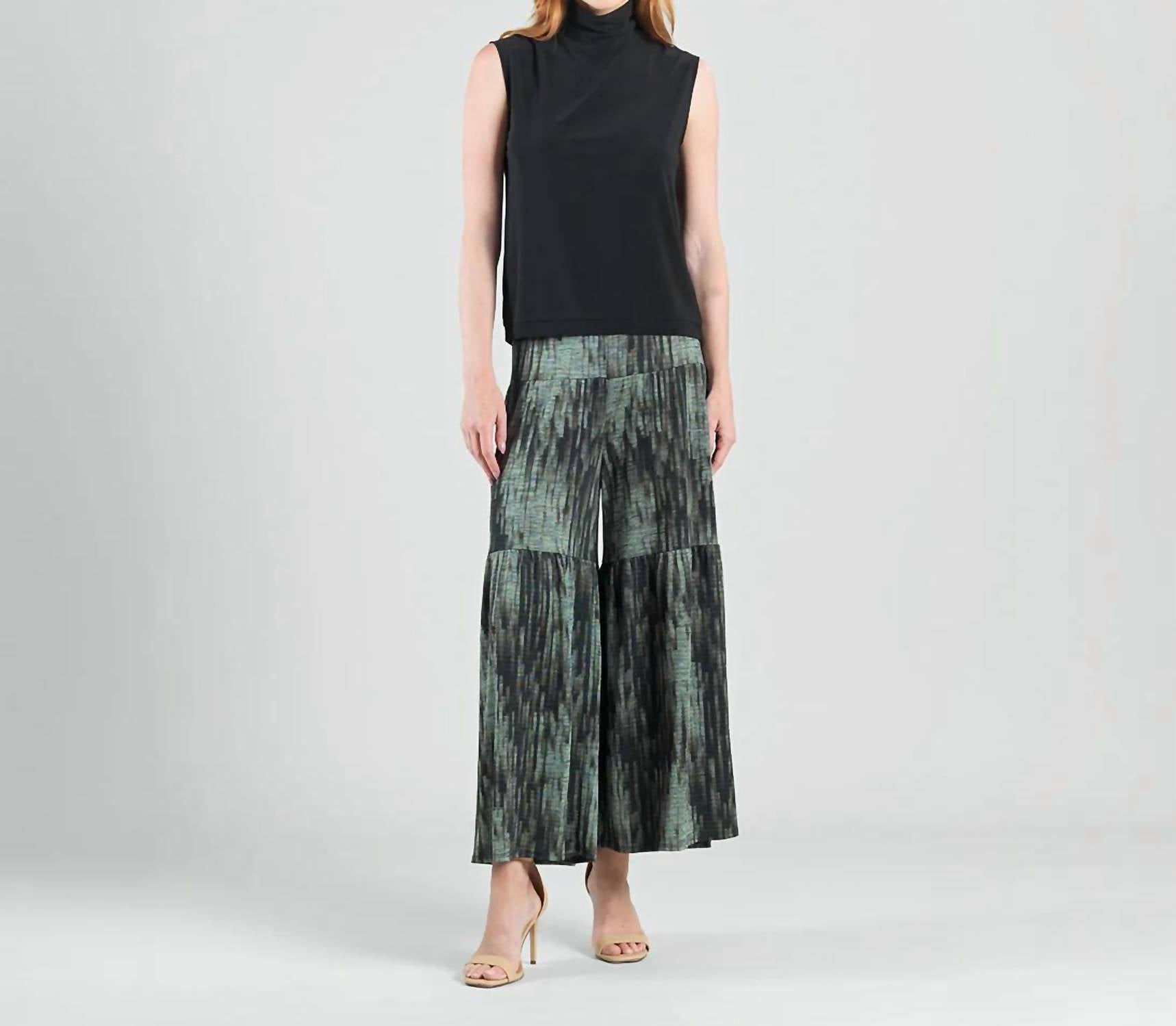 Introducing the Crinkle Pleat Knit Wide Leg Pant by CLARA SUNWOO, a standout piece in an olive/black palette designed for those who love style and comfort. Featuring a high-rise fit and ultra-wide leg silhouette with a 1.5” pull-on elastic waistband, this pant mimics the flow of a skirt by providing beautiful, fluid movement with its double-tier drape. Composition: 95% Polyester, 5% Spandex. Closure: Pull-on. Care: Hand wash. Ideal for a relaxed fit, this patterned design is perfect for women who appreciate versatile and chic wardrobe additions.